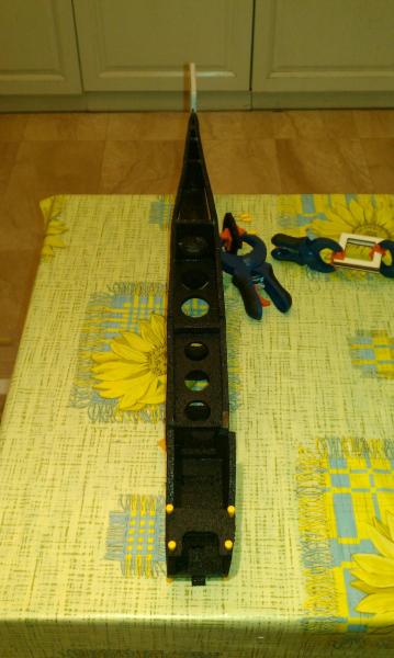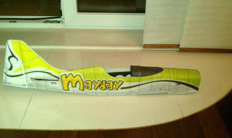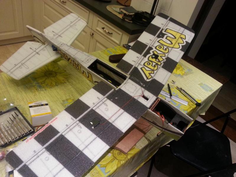 Po nazbyt długiej przerwie prace znów ruszyły. Montaż klatki podwozia wymagał nieco podcinania, ale w sumie nie nastręczał większych kłopotów. No i mogłem przejść do najtrudniejszego (zgodnie z instrukcją ) etapu budowy, czyli poszycia. Przymierzałem 5 razy, zastanawiałem się w jakiej kolejności się do tego zabrać i w końcu wymyśliłem. Najpierw zgodnie z instrukcją zamontowałem poszycie do statecznika pionowego, w następnej kolejności przykleiłem poszycie w okolicach otworów na statecznik poziomy do odpowiednich miejsc podłużnic - głównej i takiej krótkiej, obecnej tylko na tym odcinku kadłuba. Następnie skleiłem ze sobą poszycie na samym końcu od strony strony steru kierunku. Dalsze klejenie UHU Porem rozłożyłem na trzy etapy by się nie stresować, że zasechł, itp. Czyli pomału od strony ogona w stronę dziobu smarowałem po dwie wręgi i dopiero jak przykleiłem te, przechodziłem do następnych. No i wyszło chyba całkiem OK. Wygląda na całkiem prosty. Nawet z długą linijką... Wkleiłem też tablicę przyrządów. Mam nadzieję, że przyśpieszę, bo zależy mi na oblataniu modelu jeszcze w tym roku Nie przyśpieszyłem i nie udało się oblatać w ubiegłym roku... Po kilku miesiącach przerwy wznowiłem prace. Udalo mi się dobrać idealne serwa http://www.hobbyking...?idProduct=7026 - są dokładnie grubości płata, co mam nadzieję będzie widać na zdjęciach. Jako serwa steru wysokości i steru kierunku posłużyły serwa Turnigy 1800. W tej chwili model jest gotowy do montażu górnego płata i ma wstępnie zamontowane serwa. Udało się też między czasie skompletować inne wyposażenie. Teraz już na pewno ruszę z kopyta, bo chciałbym oblatać Mayday na sam początek sezonu. Poniżej kilka fotek obecnego stanu prac - widać jak ładnie schowało się w skrzydle serwo.: Górny płat wklejony na żywicę. Gniazda wsporników wystających z kadłuba podkleiłem kółkami wyciętymi z plastiku, w ten sposób żywica będzie miała większe pole styku z górnym płatem, a i pręt na większej grubości styka się z żywicą. Wkleję zdjęcia jak tylko je zrobię. Przy okazji drobna rada dla budujących - nie wkleiłem ostatniej sekcji poszycia przed skrzydłami od spodu (widać na zdjęciu), co bardzo, bardzo mi się przydało. Tę sekcję wkleję jak już będę miał zamontowaną całość elektroniki i będę pewien, że wszystko zachowuje się dokładnie tak jak powinno.