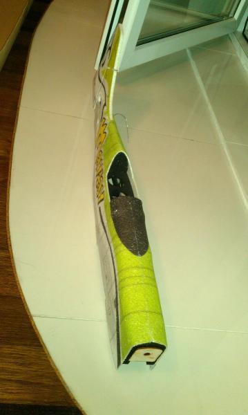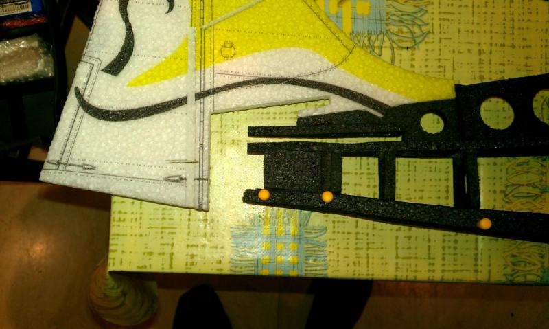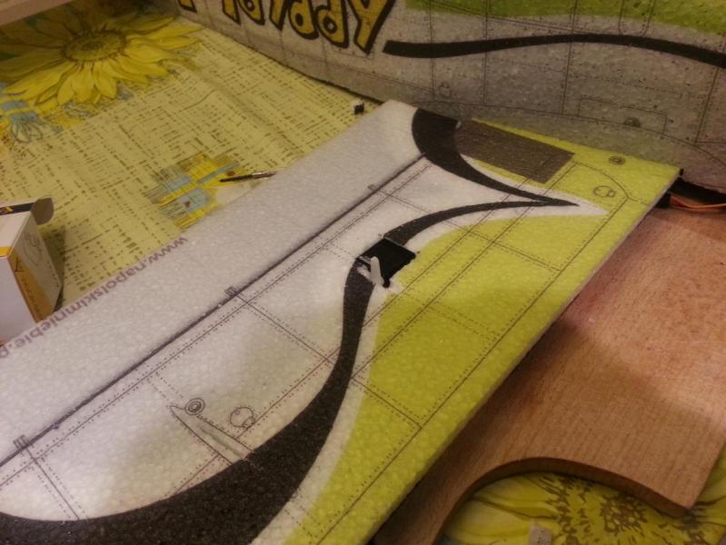 Okazało się, że suszarka nie ale żelazko modelarskie działa. Po ustawieniu temperatury na 5.5 "kreski" folia bardzo ładnie się naciągnęła. Zgodnie z instrukcją oba płaty łączy się ze sobą na stałe a całe skrzydło montuje w kadłubie na gumy do dwóch kołków wystających przed i za płatem z kadłuba. Nie podoba mi sie to klasyczne rozwiązanie i zrobiłem małą modyfikację. W krawędzi natarcia w miejscu łączenia płatów wywierciłem otwór, w który wkleiłem kołek, który będzie wchodził w otwór we wrędze. Tył skrzydła będzie na dwie śruby przykręcany do nakrętek kłowych. Zdjęcia zamieszczę jak tylko zrobię.
