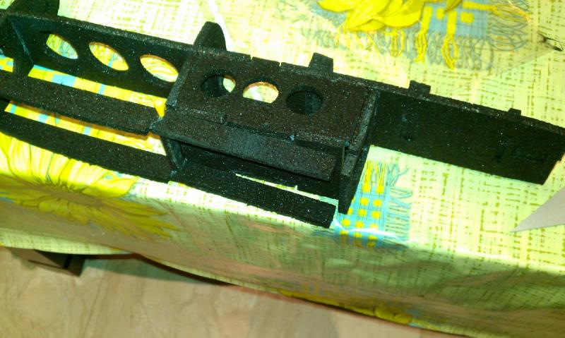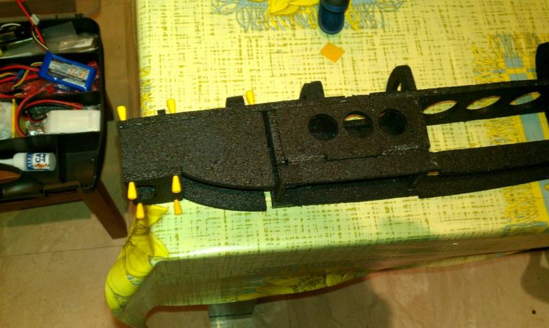 Na szczęście mecze przestały mnie już odrywać od modeli, więc budowy ciąg dalszy i od razu dalsze pytania Klatka wklejona i tak to wygląda: Po jej wklejeniu, zgodnie z instrukcją, chciałem wkleić podłużnice. Jak zwykle zanim wziąłem się za klejenie zamocowałem je przy pomocy szpilek modelarskich. Zacząłem od ogona Dbając o zachowanie symetrii kadłuba przypinałem podłużnice do kolejnych wręg, aż doszedłem do klatki akumulatora: I tu małe zaskoczenie. Po wklejeniu klatki akumulatora podłużnica nie mieści się w wycięciu wręgi i wystaje z niego ok 5mm Do tego podłużnice nie sięgają ostatniej wręgi: Zgodnie z instrukcją podłużnica pozioma załamuje się o kilka stopni na wysokości kabiny pilota. Zakładam, że będzie to skutkiem naciągnięcia podłużnic, ale wtedy załamanie tej podłużnicy to nie kilka, ale co najmniej kilkanaście stopni: Znów więc prośba - Marku, czy tak to powinno wyglądać? I co z mocowaniem podłużnic we wręgach przy klatce akumulatora?