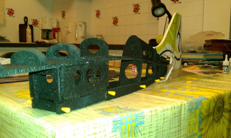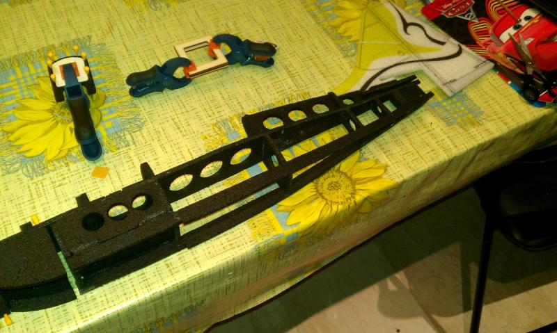 Okazało się, że dolne podłużnice trzeba wydłużyć ok 12mm. Po przymierzeniu poszycia okazało się, że podłużnica ma być najniższym elementem kadłuba - prawidłowo nie mieści się we wcięciu wręgi. Wydaje mi się, że udało mi się ustawić wszystko symetrycznie i w miarę prosto. Przymierzyłem elementy przodu - wszystko gra Sklejone klatka podwozia oraz sklejka do wręgi silnikowej. W następnym etapie, po ich wyschnięciu będę montował całość i przejdę do poszycia.