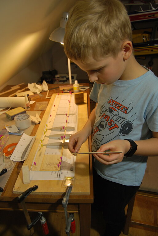 Pomimo kolejnych złych wieści (mama zmarła 7 marca po 2 miesiącach w szpitalu) postanowiłem się zebrać w sobie i wziąć z życiem za bary...była już inauguracja sezonu tydzień temu i polataliśmy nowym modelem (oblataliśmy z Szymkiem Herona od Multiplexa) a także postanowiłem wrócić do modelarni i trochę podłubać z synem przy Starterze. W święta udało nam się praktycznie skończyć kadłub (zostały takie detale jak oprofilowanie noska przy silniku i klapka rewizyjna - są już wstępnie wycięte ale jeszcze nie dopasowane. Zabraliśmy się także za lewe skrzydło i tyle udało nam się zrobić (model będzie miał skrzydła mocowane na plastikowe śrubki a nie na gumę, więc dołożyliśmy dwa wzmocnienia w centralnej części skrzydeł, które potem przewiercimy tworząc otwór pod śrubki mocujące. Tak jak zapowiadaliśmy model będzie miał również lotki (w oryginale nie było), w związku z tym przestrzeń w tylnym kesonie na długości 5 przerw pomiędzy żebrami została zamknięta listwą i potem zostanie odcięta jako lotka. Poniżej Szymek przy klejeniu skrzydła oraz efekt prac z weekendu póki co. -