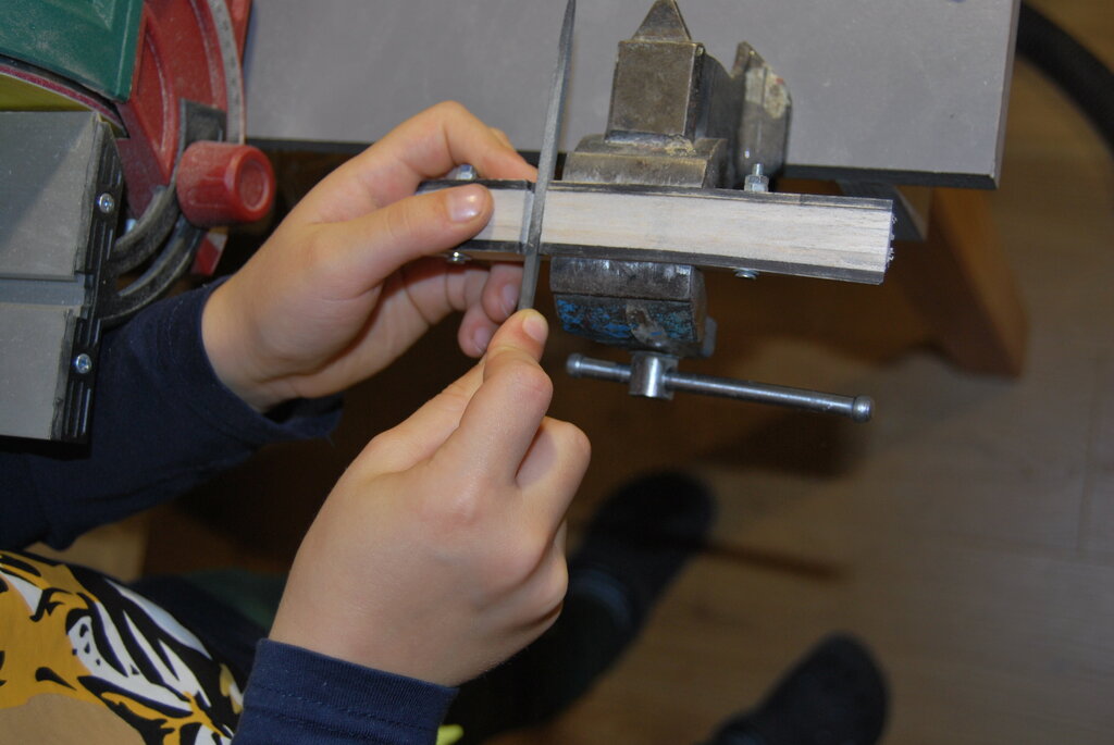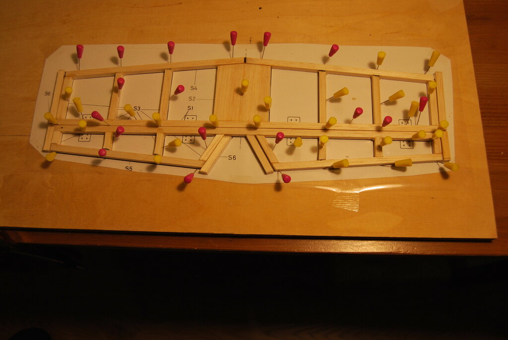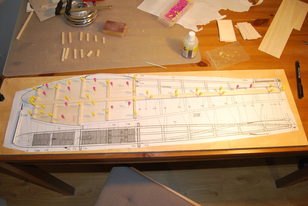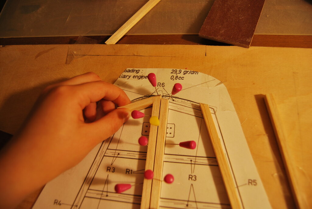 Żeby nie tracić kontaktu z lataniem zmajstrowałem Szymkowi rękawiczki z obciętymi końcówkami palców z jakiejś starej pary i póki nie będzie -10 lub śnieg zawali dojazd na lotnisko to postaramy się chociaż raz na 10 dni polatać. Wracając do tematu. Poniżej prezentujemy postępy prac. Powstało 20 żeberek podstawowych a potem wzorniki pozbyły się części materiału tak aby powstały nowe wzorniki żeberek centralnych tam gdzie na planie jest pełne krycie skrzydła balsą. W ten sposób powstało kolejnych 6 żeberek. Powstają też boki kadłuba. Szymek zrobił szablony wypełnień w przedniej części kadłuba przez naklejenia ksera tego fragmentu planu na karton i wycięcie szablonu. Powstałe tak wypełnienie oczywiście wymaga drobnych poprawek o grubość linii aby idealnie pasowało pomiędzy rozpórki na planie. Szymek nauczył się rozpoznawać z planów kierunki włókien na balsie i już zaczyna powoli łapać o co w tym chodzi(na podstawie małych eksperymentów jaki robiliśmy z niszczeniem analogicznych pod względem kształtu fragmentów z różnie ułożonymi słojami). Udało mi się przy okazji pilnowania Szymka trochę dłubnąć przy moim Mustangu i postaram się dziś wrzucić jakieś nowe zdjęcia. -
