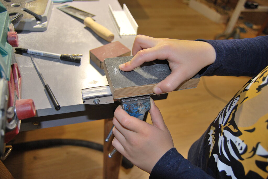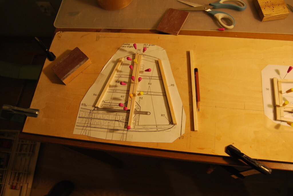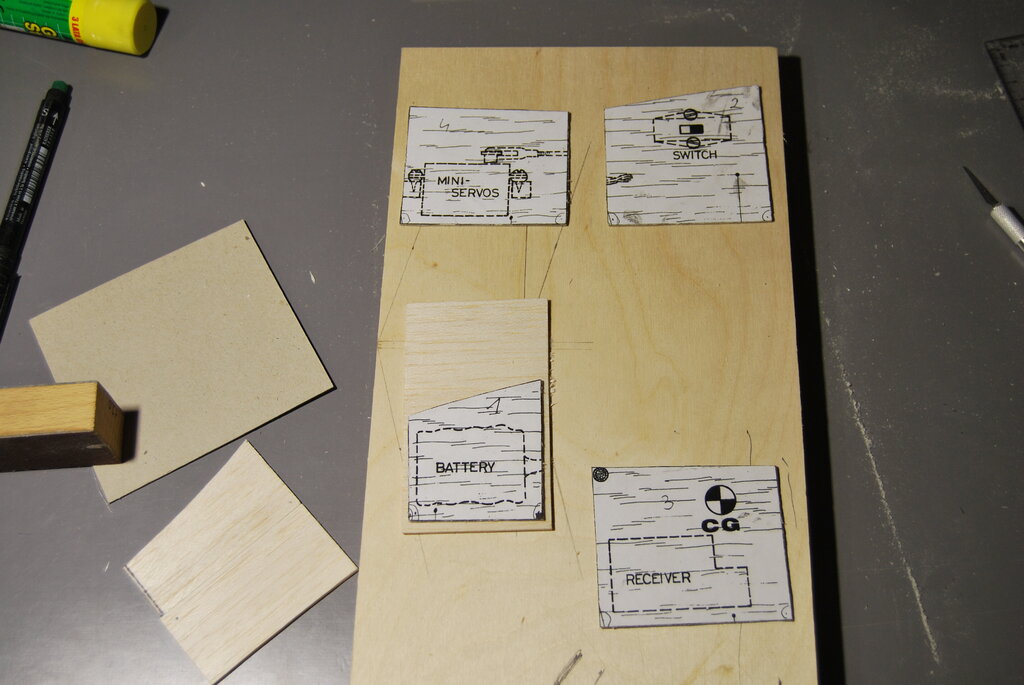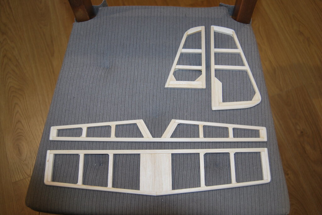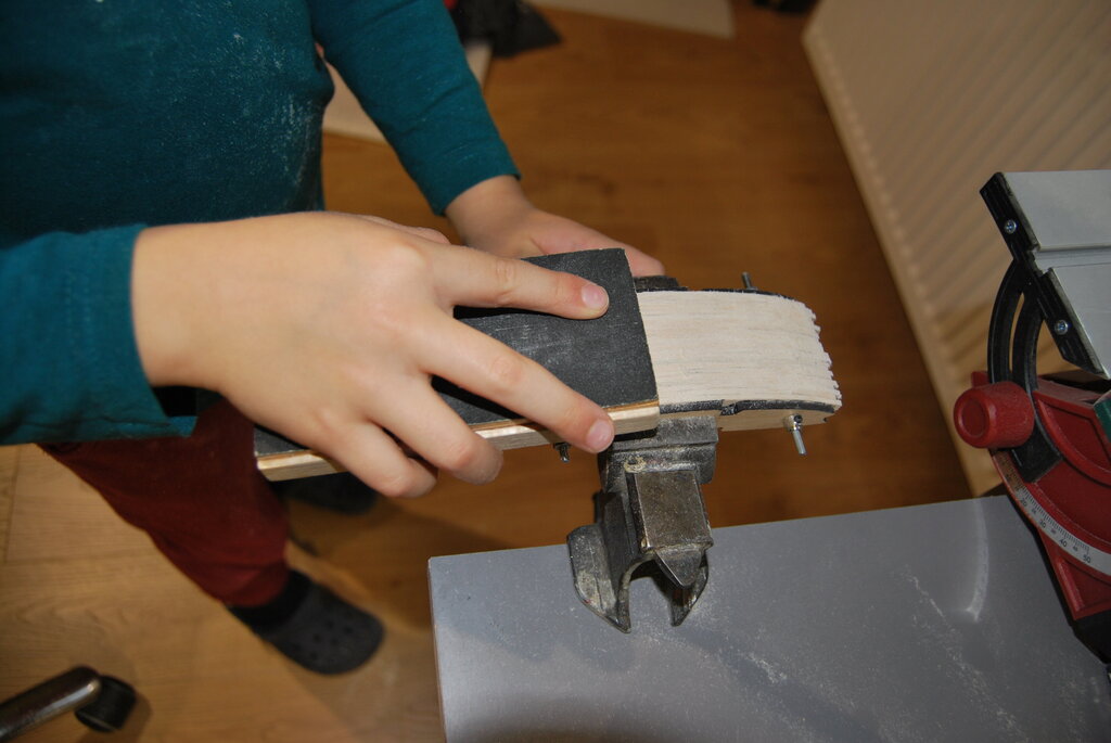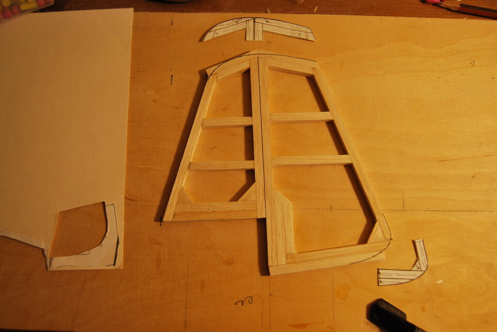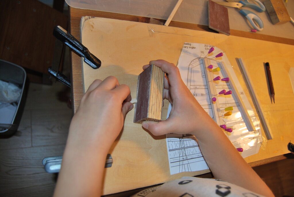 Bardzo dziękujemy za wszystkie miłe słowa i komentarze. To nas zachęca do dalszej pracy. W ostatnich dniach Szymek skończył sklejanie stateczników , po czym wyszlifował ich powierzchnie z obu stron, i zaokrąglił krawędzie tam gdzie trzeba. Do narysowania łukowatych kształtów zrobił sobie szablony z kawałka planu naklejonego na karton i wyciętego. Szablony widać na zdjęciu. Potem Tata z grubej sklejki zrobił szablony żeber głównych (ta czynność wymaga piłowania w twardej 4 mm sklejce co jeszcze jest zbyt ciężkie dla 7 latka, ręce jeszcze za słabe...potrzeba jeszcze ze 100 treningów Kung Fu na które jeździmy). Potem Szymek odrysował 22 żebra na średniej twardości balsie (potrzeba 20 ale robimy 2 na zapas jakby coś nie wyszło...). Kolejna czynność to wycinanie nożykiem. Szymek już dość dobrze sobie z tym radzi i nie podkłada palców tam gdzie nie wolno ale i tak mam stracha za każdym razem. Wycięte elementy zostały złożone wraz z szablonami pomalowanymi czarnym markerem (tak aby było wiadomo kiedy przesadzamy ze szlifowaniem) w blok, i zaczęło się szlifowanie. Po 10 minutach ręce mu osłabły i się poddał. Jutro dalsze szlifowanie i tak aż do skutku. Za kilka dni mamy nadzieję zdać relację z kolejnych postępów w pracach. -