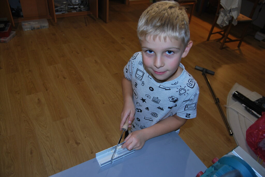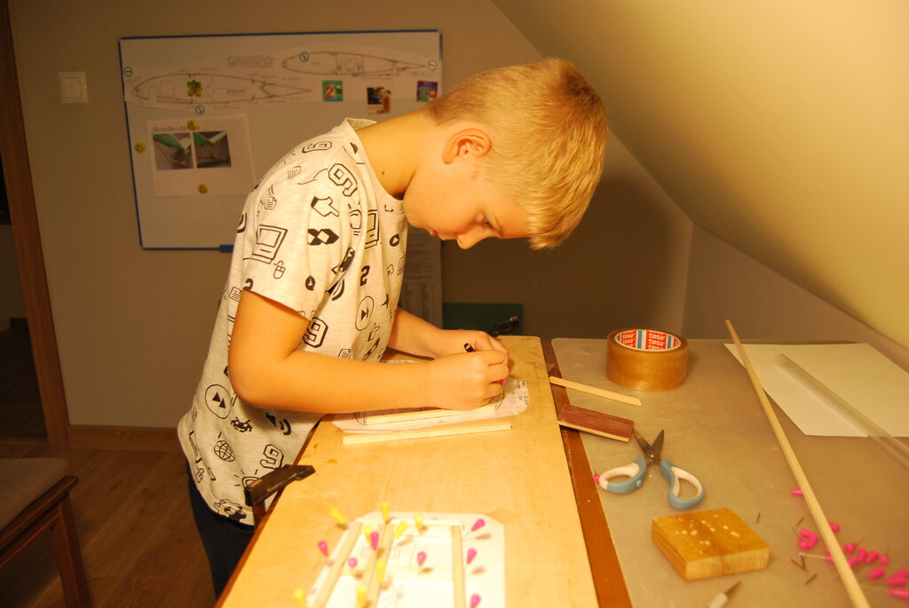 Dzień dobry wszystkim, Ta relacja będzie nieco odmienna od innych gdyż mam zamiar przedstawić wam w imieniu mojego 7 letniego syna Szymona budowę modelu motoszybowca STARTER z napędem spalinowym. Napęd stanowił będzie Cox Baby Bee 0,8 cm, dokładnie tym ze zdjęcia poniżej, nówka sztuka, nie śmigany! Starter to bardzo fajny konstrukcyjny model który lata temu był sprzedawany jako zestaw do budowy firmy Svenson. Tak to się prezentowało: Natrafiłem na jego plany w Internecie poszukując dla Szymka pierwszego konstrukcyjnego zestawu na którym mógł by doskonalić technikę budowy. Mamy już za sobą jakieś proste depronowo-balsowe gumówki, zbudowaliśmy zeszłej zimy klasyczną jaskółkę i całkiem dobrze mu to szło. W tym sezonie oblataliśmy Piankowego Pioneerka a Szymek lata już na tyle dobrze, że próbuje pierwszych pętli i ląduje praktycznie pod nogi. Sam jestem zdziwiony, że to tak sprawnie poszło. W modelu wprowadzimy jedną zmianę - będzie wyposażony w lotki gdyż Szymek sprawnie ich używa i jest już do nich bardzo przyzwyczajony. Ostatnio muszę go wręcz pilnować, żeby nie zapominał o robieniu ładnych płaskich zakrętów z użyciem steru kierunku i jak mu przypomnę to go używa. Relacja będzie wyjątkowa w tym znaczeniu, że to Szymek będzie wam tu wszystko opisywał a ja tylko robię zdjęcia. Wybaczcie mu zatem ewentualne błędy stylistyczne itp. To ma być jego relacja i nie chcę mu psuć radości z jej tworzenia. Możecie wierzyć lub nie ale poza pracą z elektronarzędziami takimi jak piła do cięcia listewek do których go nie dopuszczam to całą resztę robi sam - przycina, szlifuje, skleja itp. Oczywiście sporo czasu spędzam razem z nim kontrolując i podpowiadając (znów ucierpi na tym moja budowa Mustanga ale jego rozwój i uśmiech na twarzy są dla mnie ważniejsze). Zapraszamy zatem na widownię. Plany wydrukowaliśmy w 2 egzemplarzach w skali 1:1 w lokalnej drukarni. Kosztowało nas to 20 PLN. Napęd będzie na dziobie a nie na wieżyczce żeby zaoszczędzić na wadze - chcemy żeby model długo i ładnie szybował. No to zaczynamy, oddaję klawiaturę Szymkowi: pierwszego dnia tata pociął mi deskę o grubości 6 milimetrów na listewki potem musiałem to wyszlifować papierem ściernym by pozbyć się zadziorów, tata nauczył mnie jak się posługiwać suwmiarką i sprawdzać czy listewka ma dobry wymiar w przekroju. Ok - zmiana planów - tu Tata, napisanie zdania powyżej zajęło 20 minut bo muszę wszystko pokazywać np. jak się robi polskie litery. Chyba jednak ja będę pisał a Szymek dyktował bo na chleb nie zarobię ? To piszemy (słownictwo oryginalne): Najpierw "żeśmy" przykleili plan stateczników na deskę montażową, potem zakleiliśmy plan folią żeby stateczniki się nie przykleiły do planu Potem pociąłem sobie listewki na statecznik poziomy, najpierw te długie a potem poprzeczki. Potem skleiliśmy ramkę statecznika a potem wkleiliśmy rozpórki (Szymek mówi poprzeczki). Następnie (to słowo padło po tym jak mu powiedziałem, że już jest za dużo "potem") wkleiliśmy boki statecznika (tata poprawia - zakończenia). Używaliśmy tego kleju PUREX. Ze statecznika pionowego zrobiłem na razie najdłuższe listewki i mam prawie całą "ramkę". Tak to na razie wszystko wygląda (na zdjęciu zakończenia jeszcze nie przyklejone).