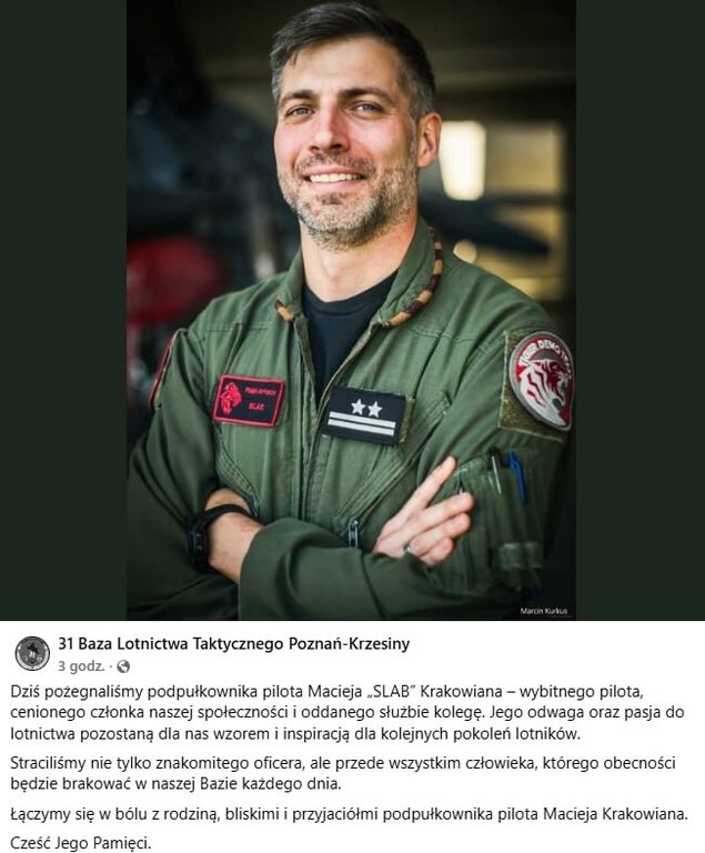 31 Baza Lotnictwa Taktycznego Poznań-Krzesiny 3 godz. · Informujemy, że zgodnie z wolą rodziny śp. mjr. pil. Macieja „Slaba” Krakowiana uroczystość pogrzebowa będzie miała charakter prywatny. Stanowczo prosimy przedstawicieli mediów o nieuczestniczenie w ceremonii oraz o powstrzymanie się od nagrywania i relacjonowania. Prosimy o uszanowanie woli rodziny i zapewnienie jej prawa do spokojnego pożegnania. https://www.facebook.com/31BLT/posts/1168812888613616?ref=embed_post