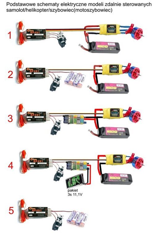 Kiedyś stosowałem połączenie jak na załączonym schemacie, korzystając ze złącza JST w pakiecie i sprawdzało się na 100%. Niestety teraz w F5J korzystam z BEC w regulatorze, bo szkoda mi wozić dodatkowe gramy, a i miejsca nie ma za dużu w kadłubie.