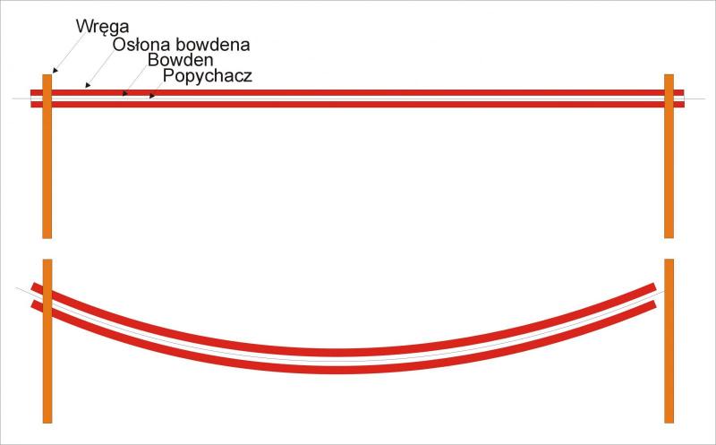 5. Krzysiek (Columb) sorry, że akurat na Ciebie trafiło ale proszę, przestańcie pisać, że bowden musi być mocowany do kadłuba. Bzdura totalna lub fantazja kogoś kto zamiast chodzić na lekcje fizyki chodził na wagary. Wystarczy, że na sztywno umocuję (np. we wręgach) początek i koniec osłony bowdena lekko naciągniętą czy naprężoną aby była prosto a nie zwisała pod własnym ciężarem. Cały odcinek między punktami mocowania może być bez jakiegokolwiek punktu podparcia i nie ma takiej siły pchającej lub ciągnącej popychacz aby go wygięła, a jeżeli już taka siła się znajdzie, to znaczy że wyrwała z wręgi mocowanie osłony bowdena albo całą wręgę Przecież jak bowden się wygina, to skraca się jego długość a jak ma się skrócić jego długość skoro początek i jego koniec są sztywno umocowane? Poniższy rysunek chyba wyjaśnia to bardziej obrazowo