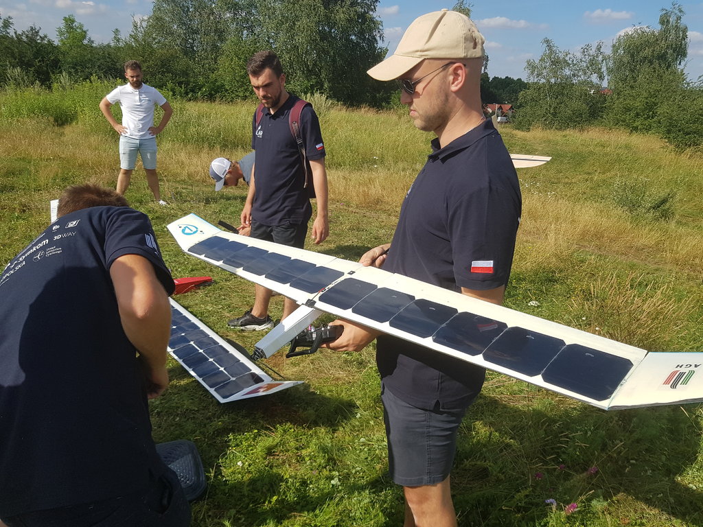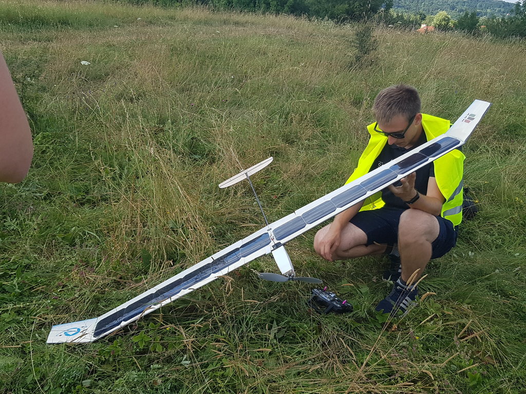 Proszę bardzo, zatem do rzeczy. ? Widoczny na zdjęciach model to 3. samolot zbudowany przez koło AGH Solar Plane. Pierwszy był o rozpiętości 3.8m był konstrukcyjny, balsowo-sklejkowy. Panele miał laminowane folią, pojedynczo, przyklejane na gotowe już skrzydło. Ten model powstał w tym roku i ma skrzydła zrobione ze styrodurowych rdzeni, laminowanych tkaniną z włókna szklanego, z panelami osadzonymi już w tkaninie. Panele to monokrystaliczne ogniwa, łączone w zespoły. Nasz sposób laminowania pozwolił na znaczne zredukowanie masy paneli, przy zachowaniu bardzo dobrej ich wytrzymałości mechanicznej oraz sprawności prawie identycznej do laboratoryjnej podanej przez producenta. Kadłub jest jeszcze balsowy, rura ogonowa węglowa, stateczniki balsowe laminowane włóknem szklanym. Rozpiętość skrzydeł modelu wynosi 1.8m, długość 1.2m, masa gotowego do startu to 600g. Napędzany silnikiem Dualsky ECO 2303C ze śmigłem 9x4.7, zasilany pakietem lipo 2s, 400mAh. Dodatkowo w modelu znajdują się moduły BMS oraz MPPT, by wycisnąć jak najwięcej energii z paneli fotowoltaicznych. Bezchmurna pogoda w pełni pozwalała na nieprzerwane loty- energia z ogniw wystarcza na zasilenie silnika oraz jednoczesne ładowanie aku. Jednak nie lataliśmy dłużej jak 20 min, bo obserwatorzy zaczynali się nudzić. ? Natomiast jeśli pojawiały się chmury mocno ograniczające promieniowanie słoneczne, loty trwały około 10 minut. Obecnie pracujemy nad budową kolejnego samolotu o 6m rozpiętości skrzydeł, tak samo na bazie laminowanych rdzeni styrodurowych- oczywiście również z panelami. ? Kadłub w nim będzie już w pełni węglowy, o wiele bardziej opływowy, a jednocześnie bardzo pojemny- duży model będzie wyposażony w znacznie większy zestaw akumulatorów do lotu nocnego oraz dodatkowo w osprzęt umożliwiający loty autonomiczne. Kilka fotek i film prezentujący naszą najnowszą konstrukcję ? 20200801_154816.mp4