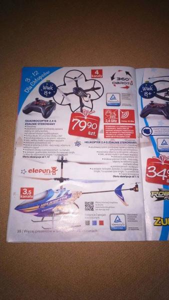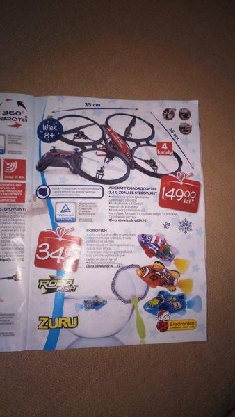 Przeglądając sobie gazetkę z biedronki, trafiłem na taką oto okazję na święta, czyli czterowirnikowy quadrocopter ( masło maślane ). Różnią się chyba tylko rozmiarem, bo obydwa są na 2,4Ghz, mają tyle samo kanałów i Li-pola. Co sądzicie o takim czymś na start z quadrocopterami ?