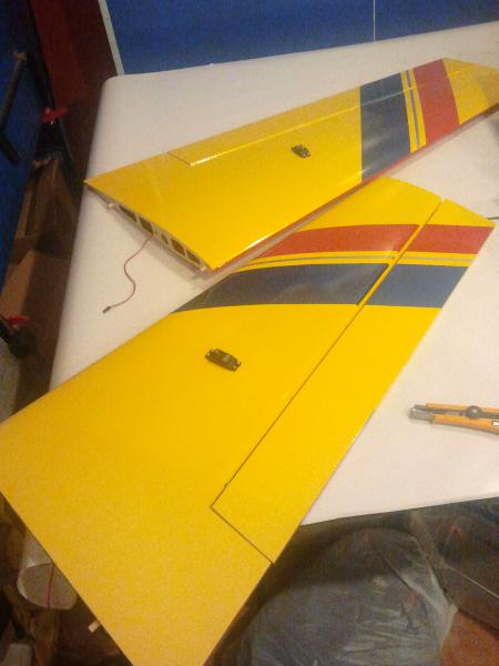 Przemyślałem jeszcze raz temat i... zacząłem składanie. Teraz już nie ma odwrotu Dzisiaj powklejałem zawiasy w kierunek oraz zamontowałem lotki i serwa w skrzydłach. Sorki za tragiczne fotki. -