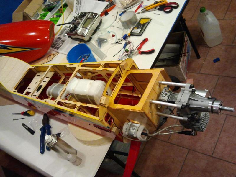 Tak wygląda Extra na chwile obecną. Gotowe usterzenie z zainstalowanymi serwami. Serwa również obsadzone w skrzydłach oraz chwilę temu - pierwsza przymiarka silnika. Czy to benzyny 35 ccm należy stosować amortyzartory gumowe pod silnik czy jeszcze można je sobie darować ? -