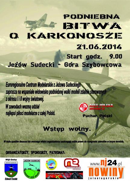 Cześć!! Mamy przyjemność zaprosić całe grono miłośników ESOwania na zawody pt: "Bitwa o Karkonosze", które odbędą się 21 czerwca na Górze Szybowcowej w Jeżowie Sudeckim koło Jeleniej Góry. Zawody rozgrywać będziemy w kategorii WWI i WWII a punkty będą zaliczane do klasyfikacji generalnej Pucharu Polski. Zgłoszenia na zawody proszę wysyłać od dzisiaj do dnia 20 czerwca na adres: raf150(małpa)op.pl w tytule: BITWA O KARKONOSZE Imię i Nazwisko Eskadra/Miejscowość ESA 21.06.2014 WWI - TAK/NIE kanał WWII - TAK/NIE kanał Z imprezą startujemy o 9.00 i wstępnie tak by wyglądał plan: Orientacyjny plan zawodów: 09:00 - 09:30 - Rejestracja zawodników 09:30 - 10:00 - Odprawa i rozpoczęcie zawodów 10:00 - 11:00 - I runda WWII 11:00 - 12:00 - I runda WWI 12:00 - 13:00 - II runda WWII 13:00 - 14:00 - II runda WWI Przerwa obiadowa 14:00 - 15:00 - III runda WWII 15:00 - 16:00 - III runda WWI 16:15 - 16:30 - Finał WWII 16:35 - 16:50 - Finał WWI 17:30 - 18:00 - Zakończenie zawodów Wpisowe w wysokości 30zł przy rejestracji w dniu zawodów. ZAPRASZAMY!!