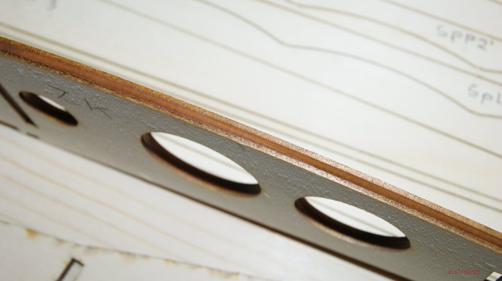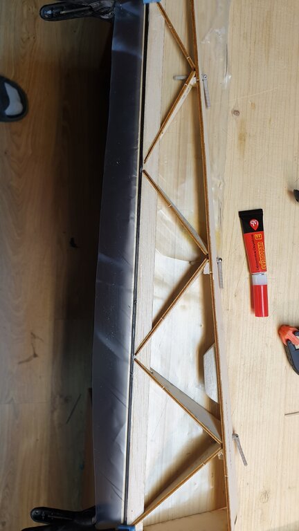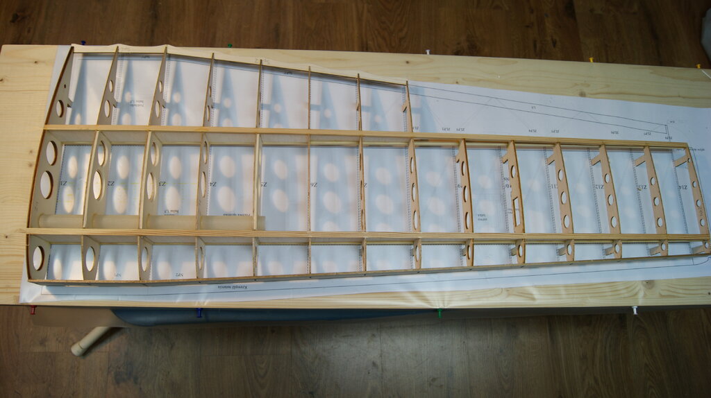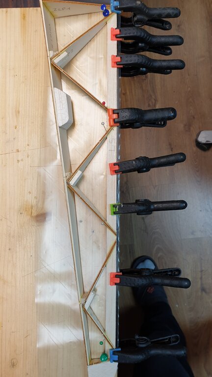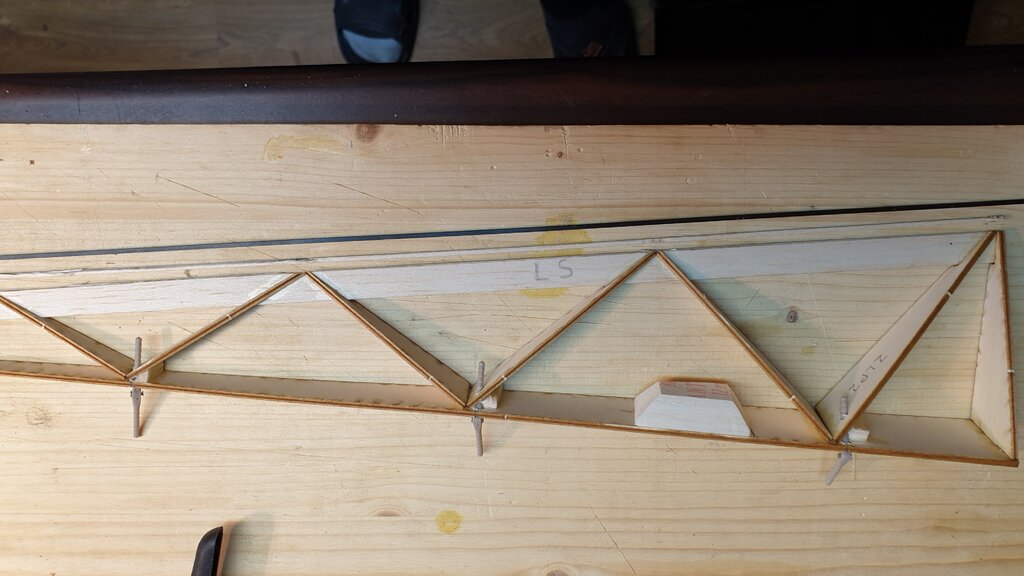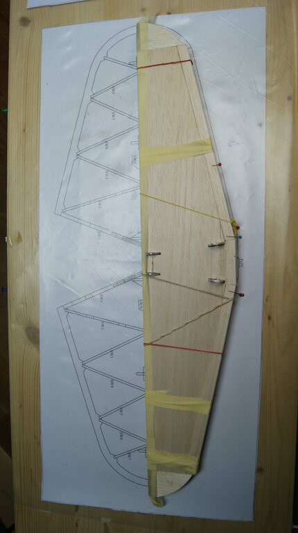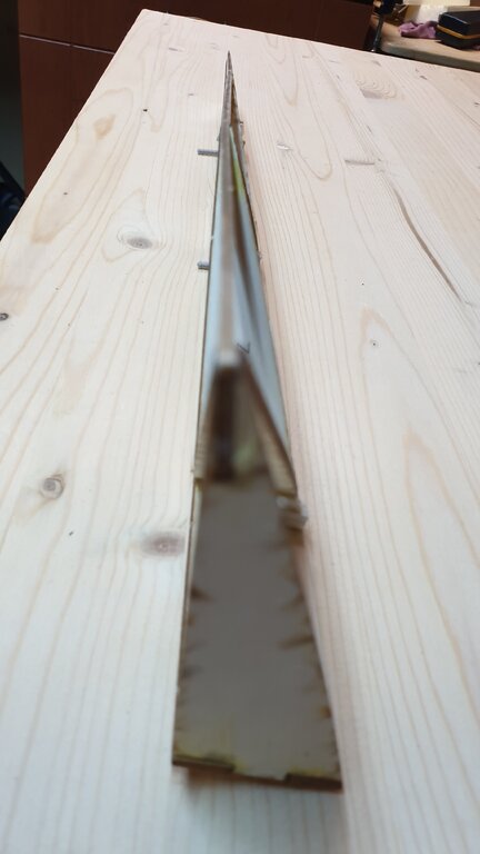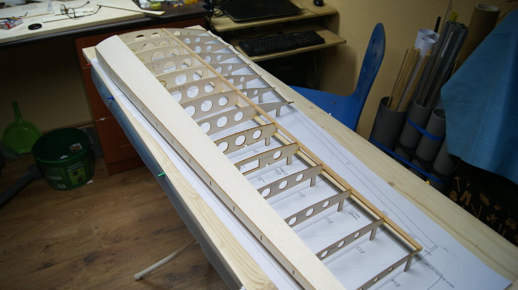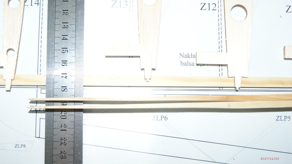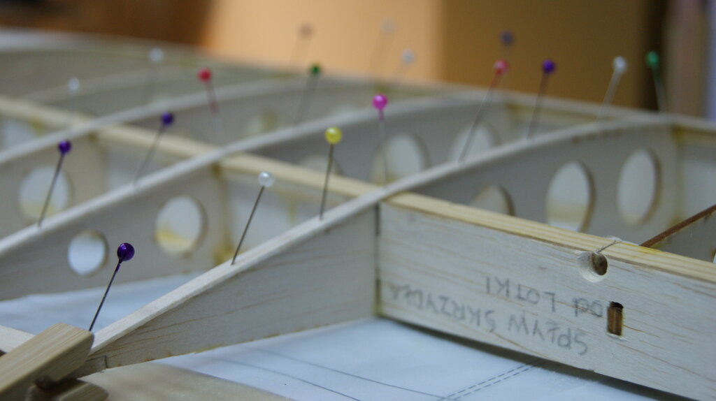 Przy sklejaniu lotki pojawił się pierwszy błąd. Krawędź spływu została wycięta z balsy 2 mm, która okazała się za słaba - uległa zwichrowaniu. Krawędź tylną listwy spływu obcięto (2 mm.) i zastąpiono płaskownikiem węglowym 2x2 mm. Ciekawe czy po oklejeniu znowu się odkształci ?i Na razie jest prosta.