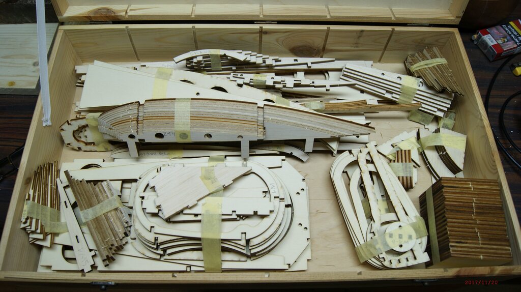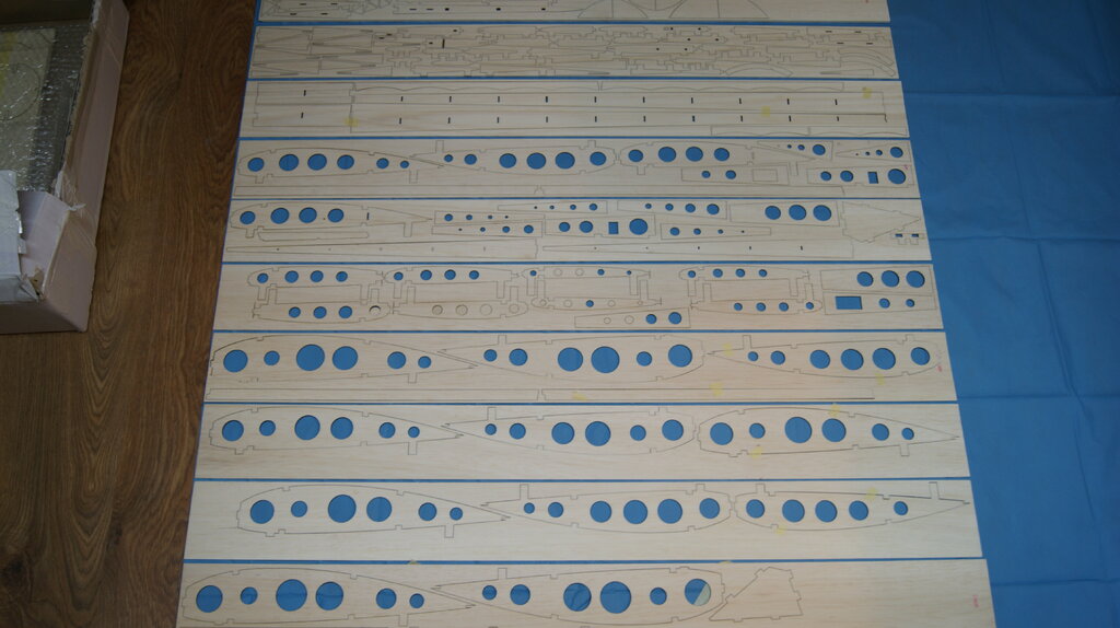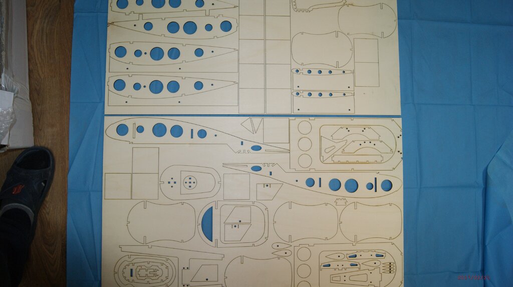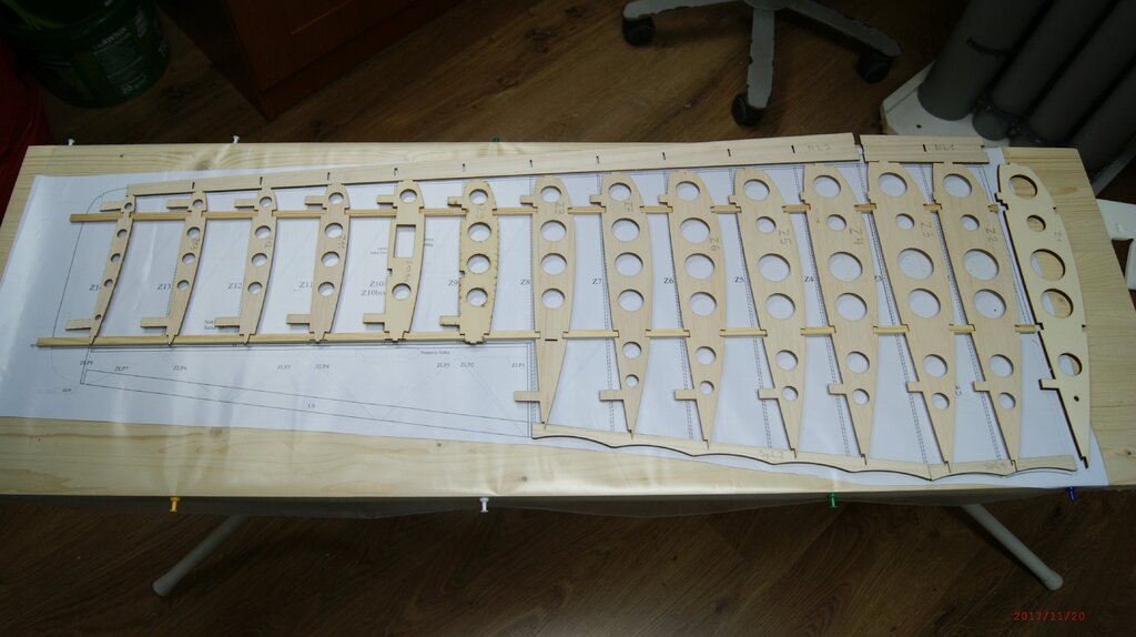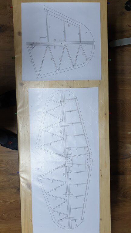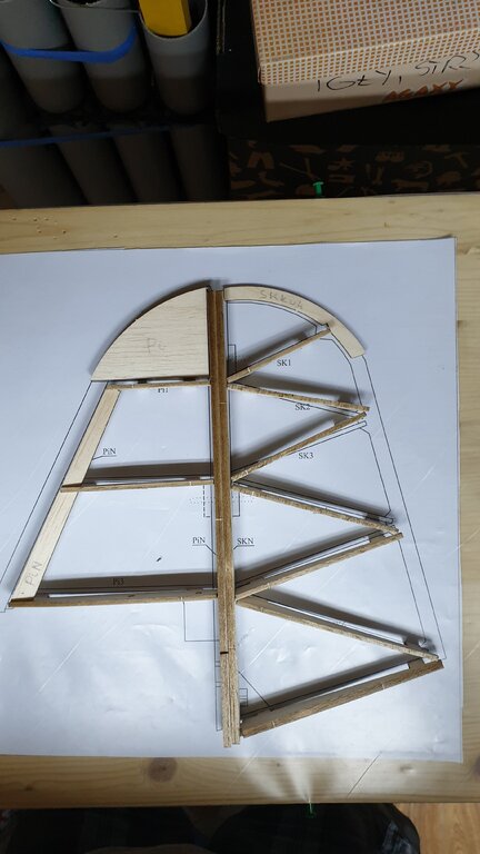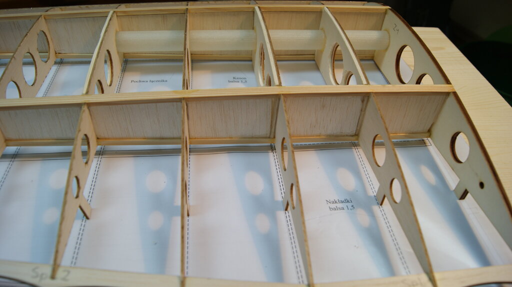Witam! Będę próbował podzielić się wrażeniami z budowy modelu RWD 5 Bis według własnych planów narysowanych przy pomocy programu TurboCAD. Rozwiązania konstrukcyjne oparłem na podstawie obserwacji budowy tego modelu przez Pana HenrykaS. niektóre lekko modyfikując. (https://pfmrc.eu/index.php?/topic/26181-rwd-5-bis-132-relacja-z-budowy/), i planów W. Schiera. Sylwetkę i proporcje odwzorowałem na podstawie rysunków zawartych w artykule Stanisława Maciąga - RC Przegląd Modelarski 10/2011. Skala modelu – 1: 4,3. Rozpiętość - 2120 mm. długość - 1500 mm. Waga – nie wiem. Plany rysowane były pod napęd spalinowy ale w końcu zdecydowałem się na napęd elektryczny. Plany zostały zmodyfikowane pod silnik BL50 525KV Brushless Outrunner Motor (EFLM7450) z regulatorem 60A Pro. Silnik został wyjęty z modelu E-flite Carbon-Z Cub 2m. Zasilanie LiPo 6S. Boje z TurboCAD ilustruje wątek: https://pfmrc.eu/topic/40745-rwd-5-bis-rysowany-przy-pomocy-cad/. Program TC wygenerował następujące obrazy: Konstrukcja wygląda następująco: A tak w wypełnieniem balsowym Przy budowie posługuję się następującymi planami: Formatki do wypalenia: Po wypaleniu: Byłem pod wrażeniem precyzji technologii laserowej niedoścignionej nawet dla wirtuozów laubzegi (chyba). Budowę rozpocząłem od skrzydła Ścieńczenie końcówki belek dźwigarów jest konieczne aby zmieściły się w profilu. Zakotwiczenie kieszeni łącznika skrzydeł dodatkowo zostały wzmocnione "owocówką" Kieszeń łącznika wykonano w sposób tradycyjny: Komponenty dobrane objętościowo wg przepisu: Wypełnienie pomiędzy belkami dźwigarów: Cdn.