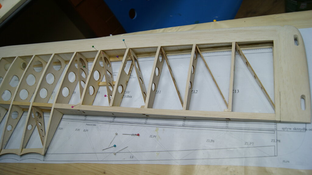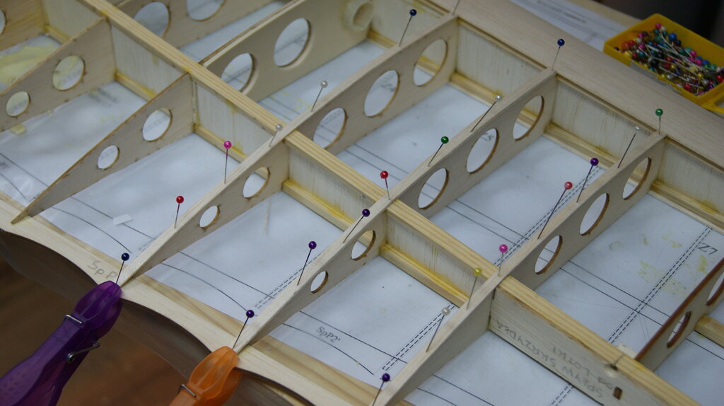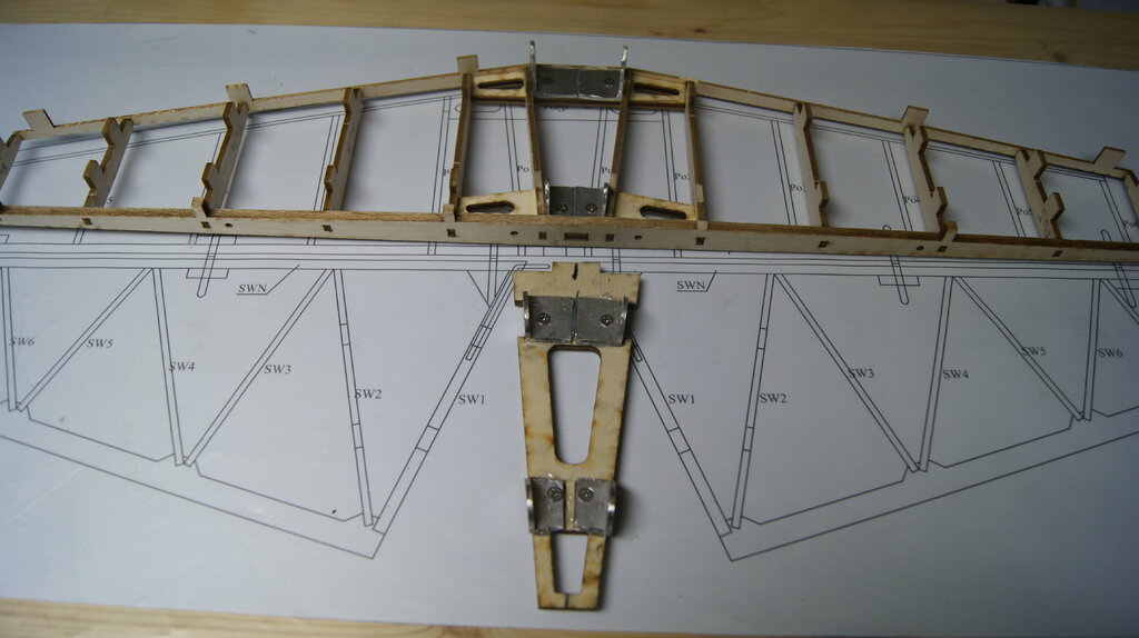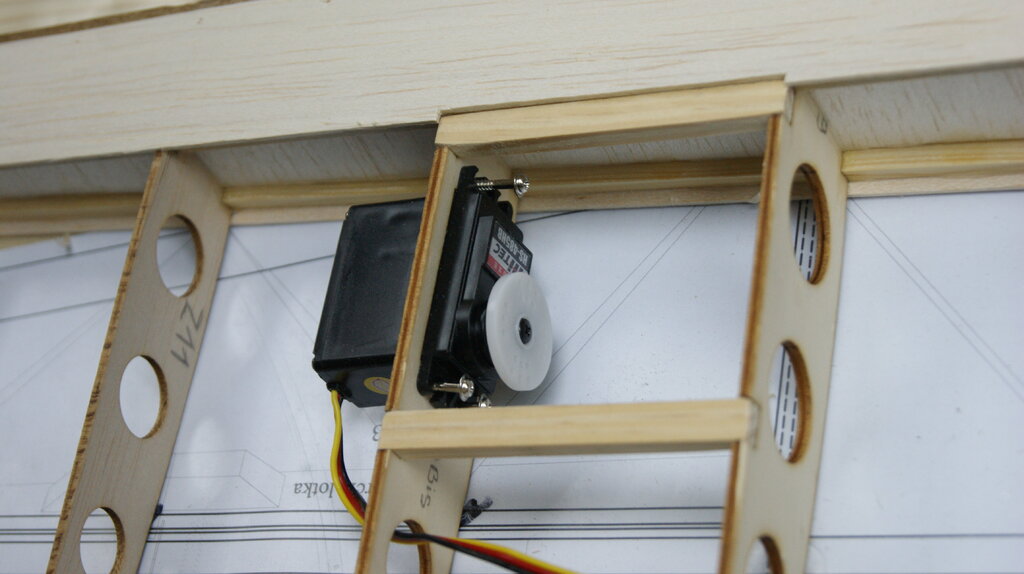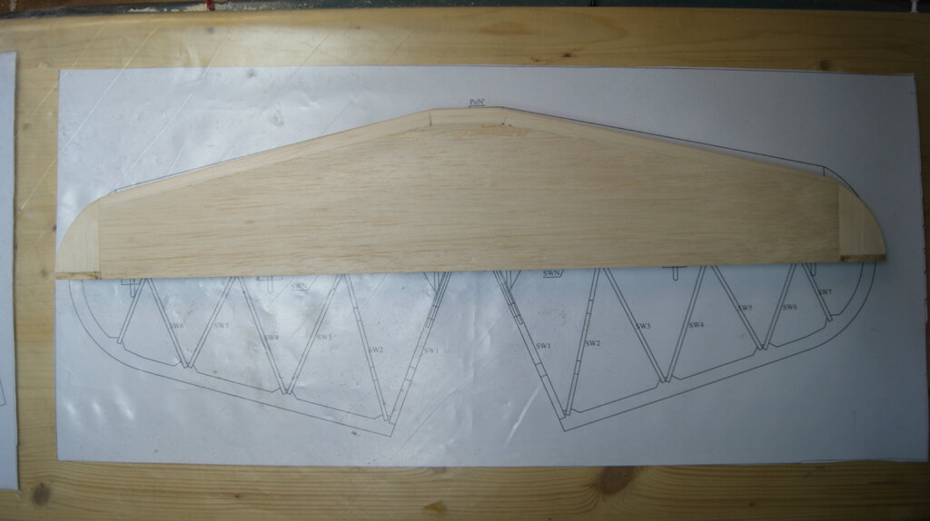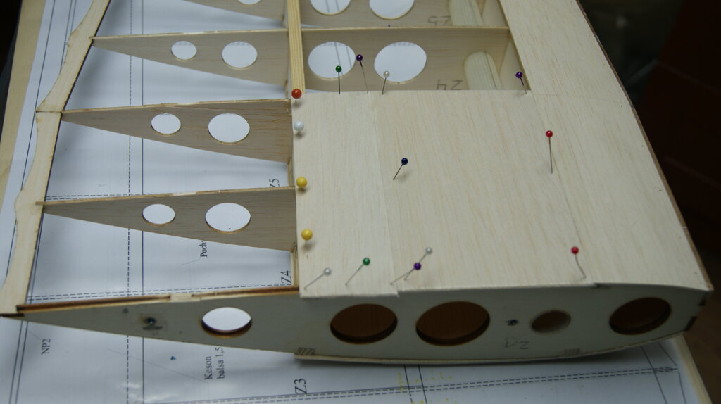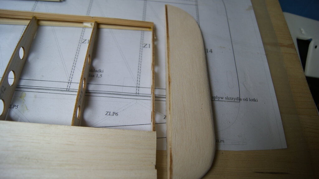 Montaż kesonu: Listwa natarci: Zakończenia skrzydeł wystrugane z klocka balsowego Przymiarka gniazd oświetlenia ledowego nakładki na rzebra i listwy: Przymiarka serwa lotki: konfrontacja z planem: Gwoli ścisłości to skrzydła mają profil - nasadowy Clark YM 18% a profil końcowy Clark YM 9%.. Kat zaklinowania skrzydła +3 st. Powierzchnia statecznika poziomego jest mniejsza od zalecanego przez Schera. Plany nie były poddawane żadnym obliczeniom teoretycznym i dlatego właściwości lotne tego co powstanie są wielka niewiad