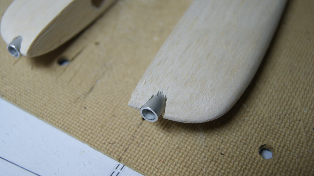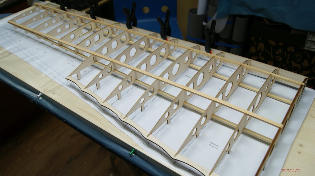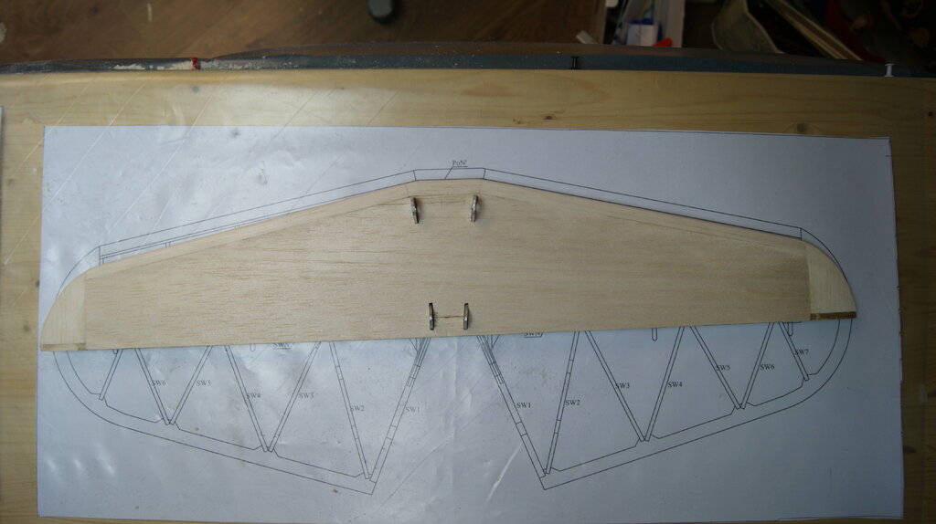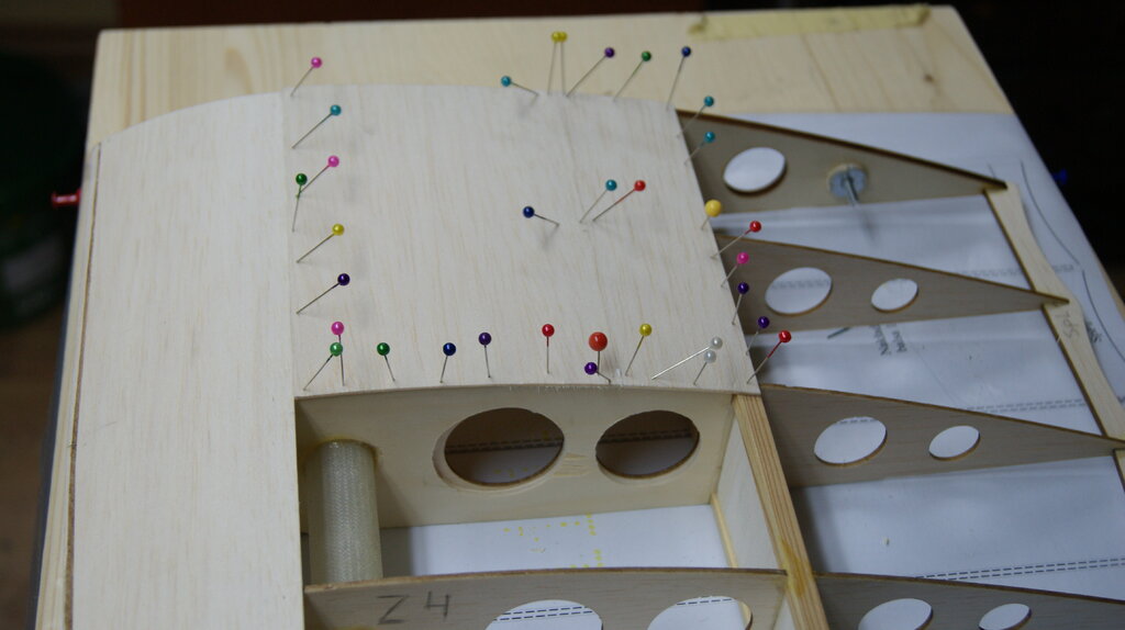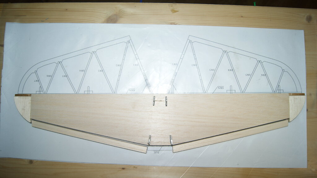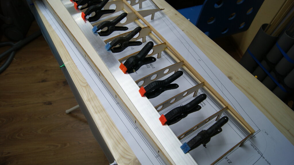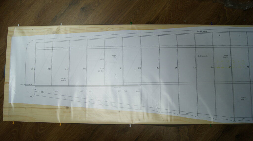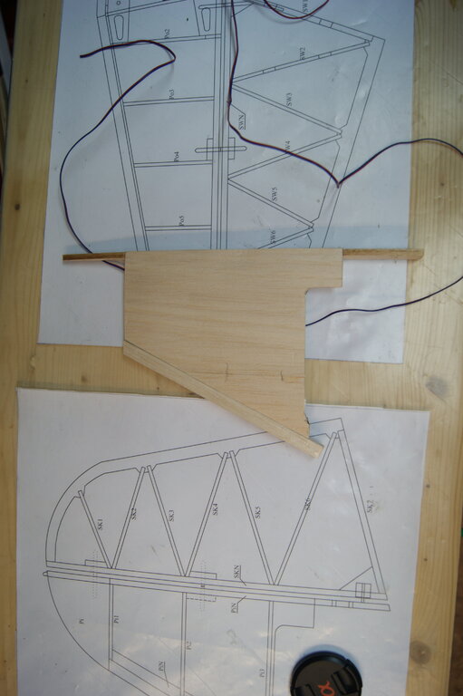 Montaż kesonu: Listwa natarci: Zakończenia skrzydeł wystrugane z klocka balsowego Przymiarka gniazd oświetlenia ledowego nakładki na rzebra i listwy: Przymiarka serwa lotki: konfrontacja z planem: Gwoli ścisłości to skrzydła mają profil - nasadowy Clark YM 18% a profil końcowy Clark YM 9%.. Kat zaklinowania skrzydła +3 st. Powierzchnia statecznika poziomego jest mniejsza od zalecanego przez Schera. Plany nie były poddawane żadnym obliczeniom teoretycznym i dlatego właściwości lotne tego co powstanie są wielka niewiad