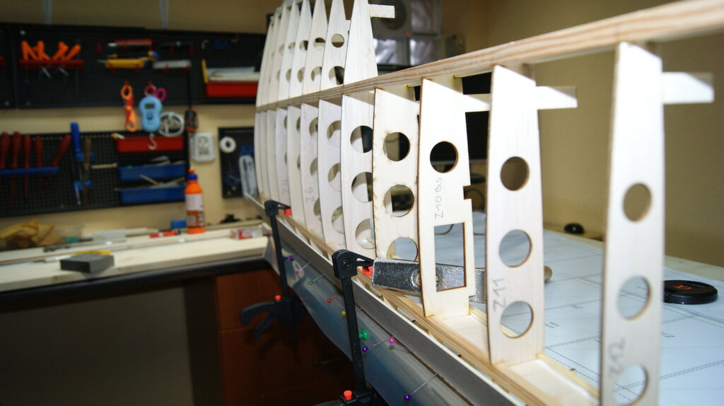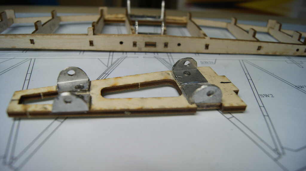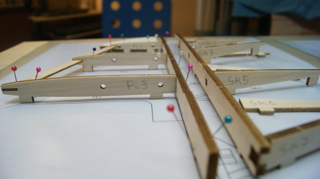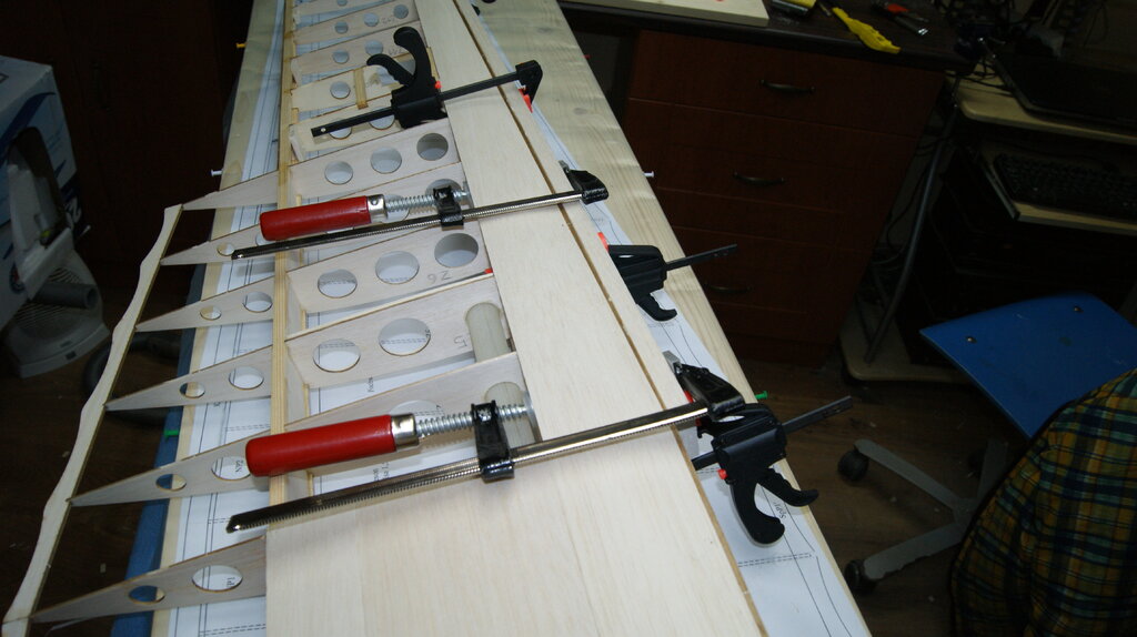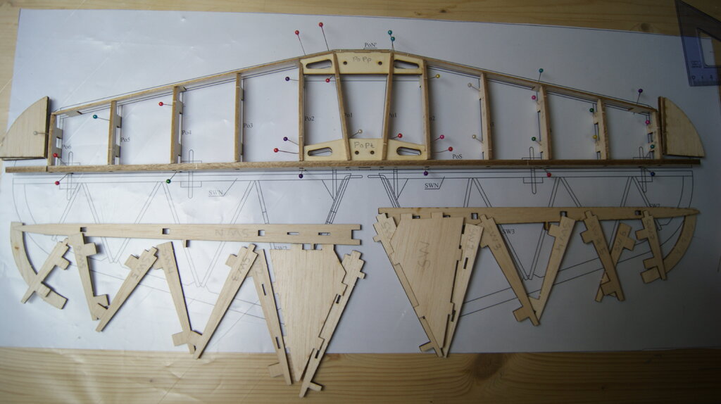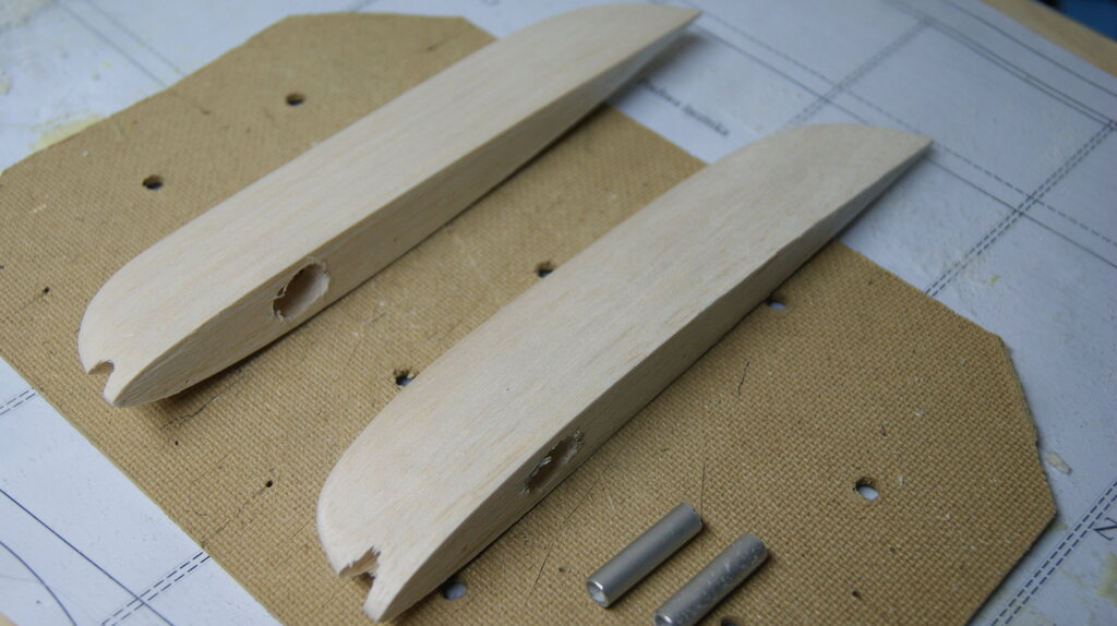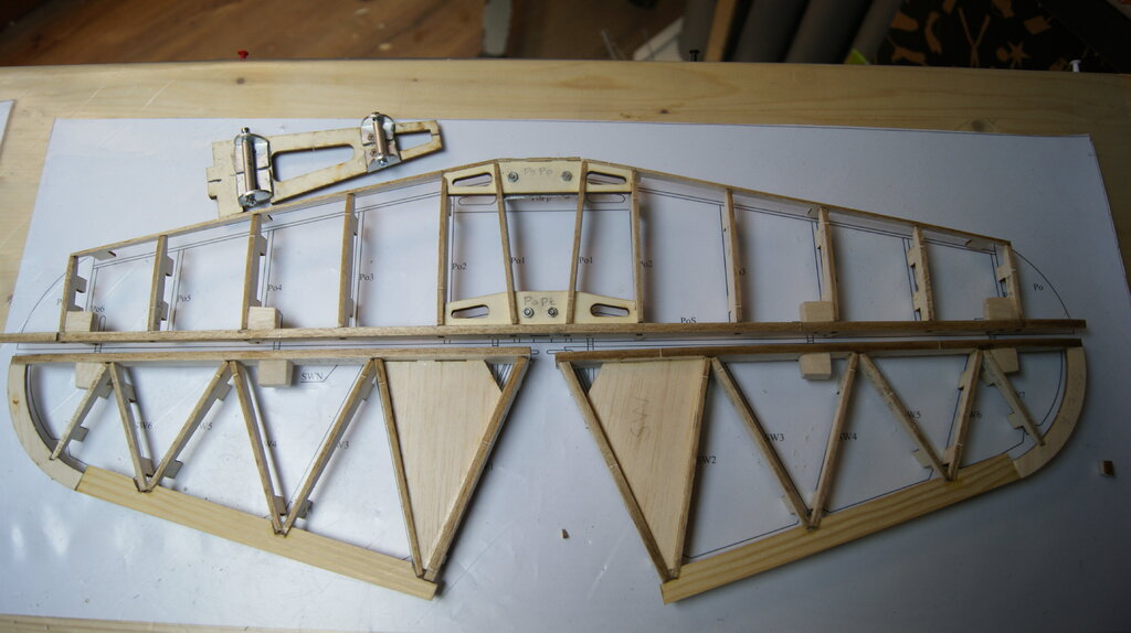 Montaż kesonu: Listwa natarci: Zakończenia skrzydeł wystrugane z klocka balsowego Przymiarka gniazd oświetlenia ledowego nakładki na rzebra i listwy: Przymiarka serwa lotki: konfrontacja z planem: Gwoli ścisłości to skrzydła mają profil - nasadowy Clark YM 18% a profil końcowy Clark YM 9%.. Kat zaklinowania skrzydła +3 st. Powierzchnia statecznika poziomego jest mniejsza od zalecanego przez Schera. Plany nie były poddawane żadnym obliczeniom teoretycznym i dlatego właściwości lotne tego co powstanie są wielka niewiad