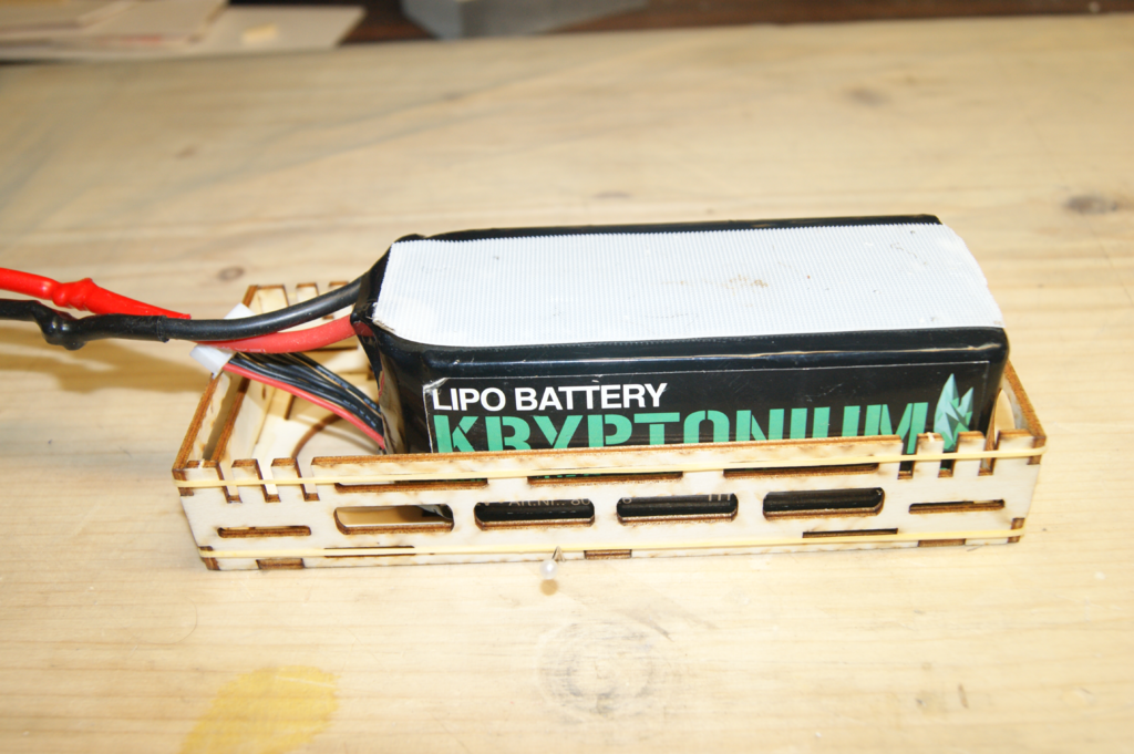 Przewidywany napęd elektryczny spowodował konieczność wykonania pojemnika dla baterii zasilających. Konstrukcja zamocowania umożliwia łatwe przesuwanie i tym samym regulację środka ciężkości. Pojemnik mieści LiPo 6S albo 2x3S połączone szeregowo:
