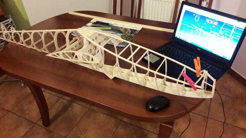 9. Po roku od wycięcia kończymy kadłub 3 prototypu. Pozostało jedynie dokończyć statecznik pionowy, dokonać małe poprawki szpachlą i rozpoczynamy pokrywanie kadłuba tkaniną szklaną 80 g/m2. Następnym etapem będzie wykończenie statecznika poziomego oraz sterów i pokrycie ich folią oratex antique. I coś owocowego Kadłub, bez SK i statecznika poziomego waży na tą chwilę 1752g.