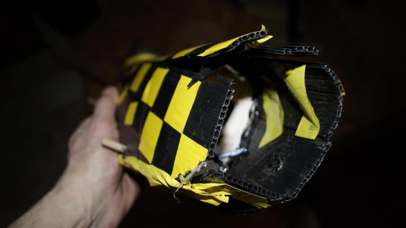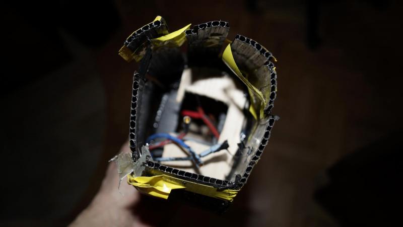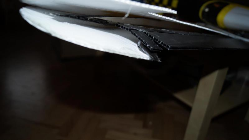 Chyba będę musiał przetestować tą "aktywację " palnikiem, ale po kolei. Pokleiłem, masa do lotu wyszła 950g, Trochę wiało, ale nie za mocno. Wyrzut, i po 2 kółku brak reakcji na stery. jak uderzył w ziemię nie widać, ale wysokość i prędkość widać prawie do końca. no i teraz straty: skrzydło się rozkleiło - jednak czarny hotglut nie trzyma aż tak dobrze. kadłub pękł w kilku miejscach: wręgi z balsy to nie był dobry pomysł, jedna , sklejona z 2 warstw coroplastu nieruszona. Uderzenie połamało firewall z panela podłogowego