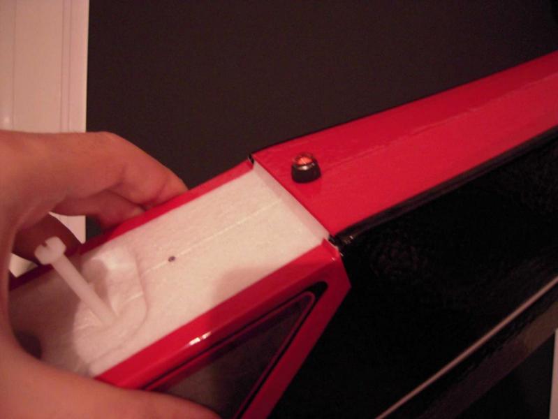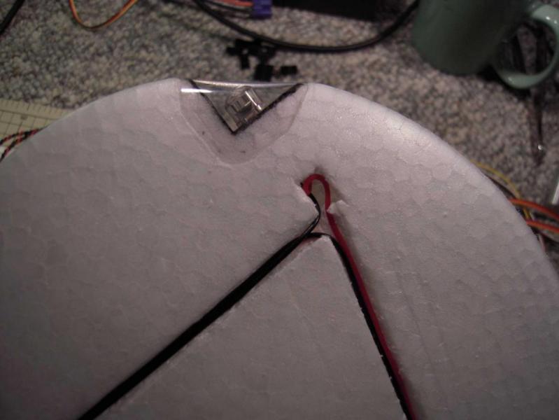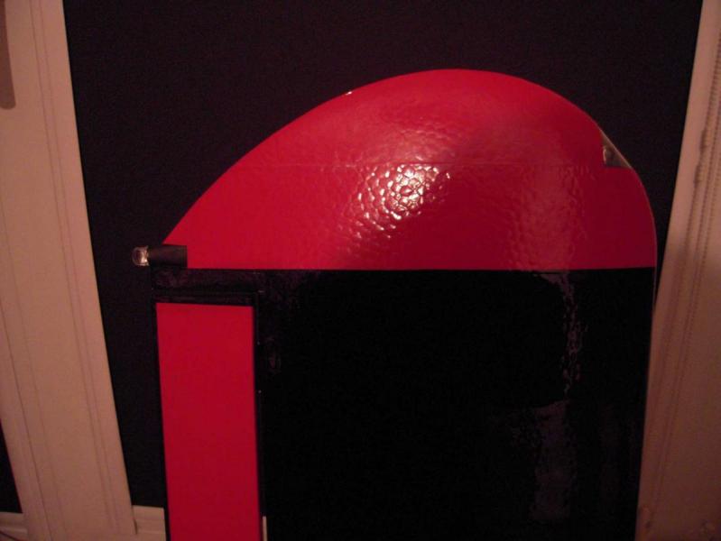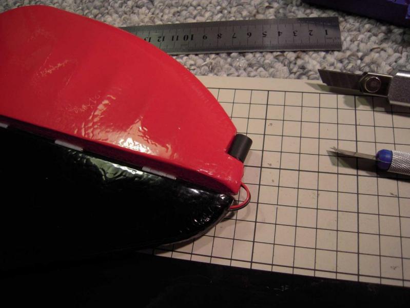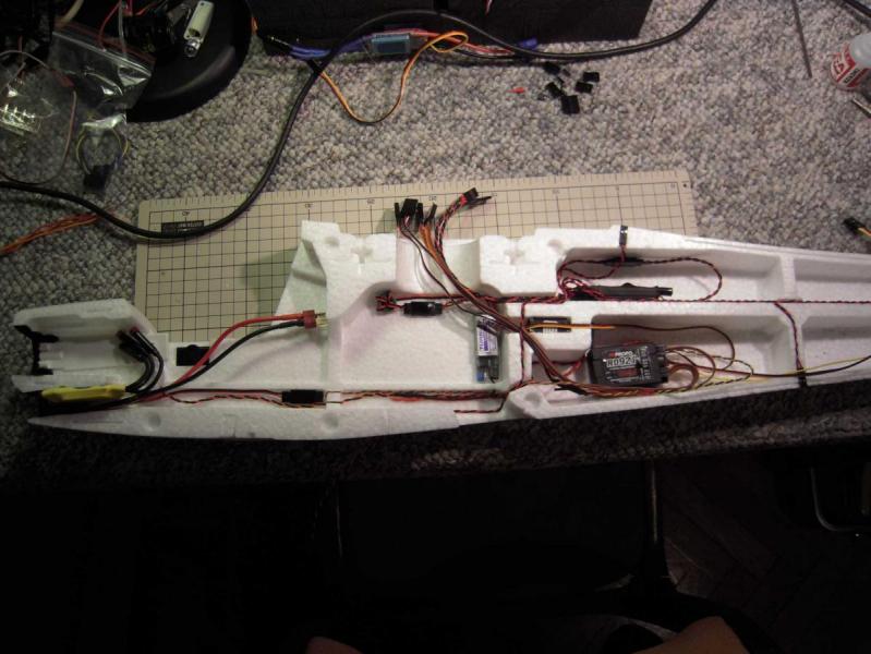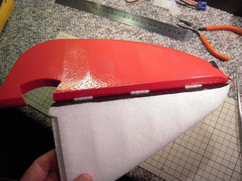 Oracover dość wdzięcznie klei się do elaporu w 100 stopniach - pytanie jak długo się utrzyma . Zmatowiłem powierzchnię elaporu przed pokryciem za pomocą papieru 400. Dałem zawiasy. Zapakowałem Rx i moduł oświetlenia w tylną część kadłuba - obym tego nie żałował