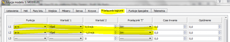 Tak. Poniżej masz screeny przykładowej konfiguracji. Wario jest aktywowane przełącznikami logicznymi L1 i L2. Przełączniki włączają się tylko gdy spełnione są dwa warunki czyli przełącznik SA1 w górnym położeniu i prędkość wznoszenia jest większa niż 0,5m/s (L1) lub mniejsza niż -1m/s (L2) Oczywiście przełącznik możesz sobie ustawić dowolny i prędkości wznoszenia i opadania też dobierasz pod swoje preferencje.