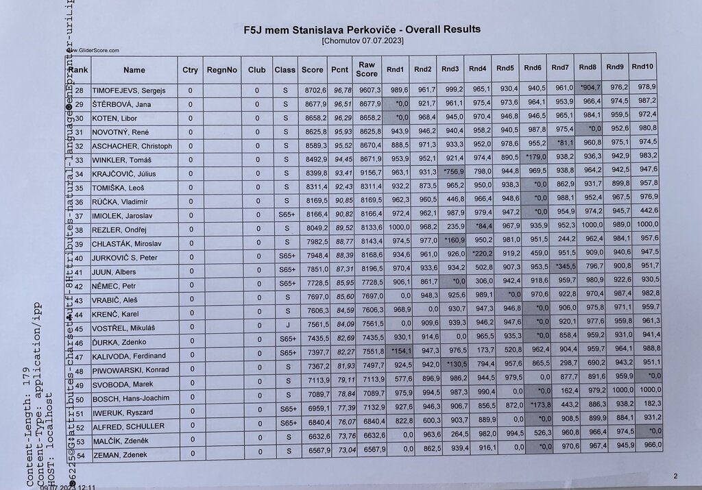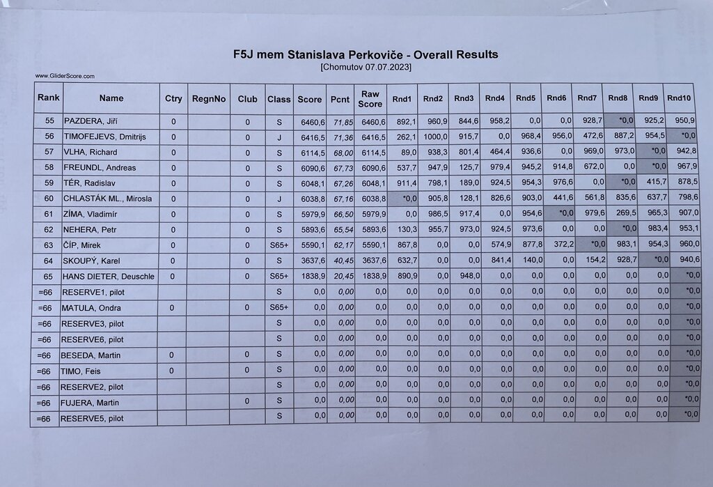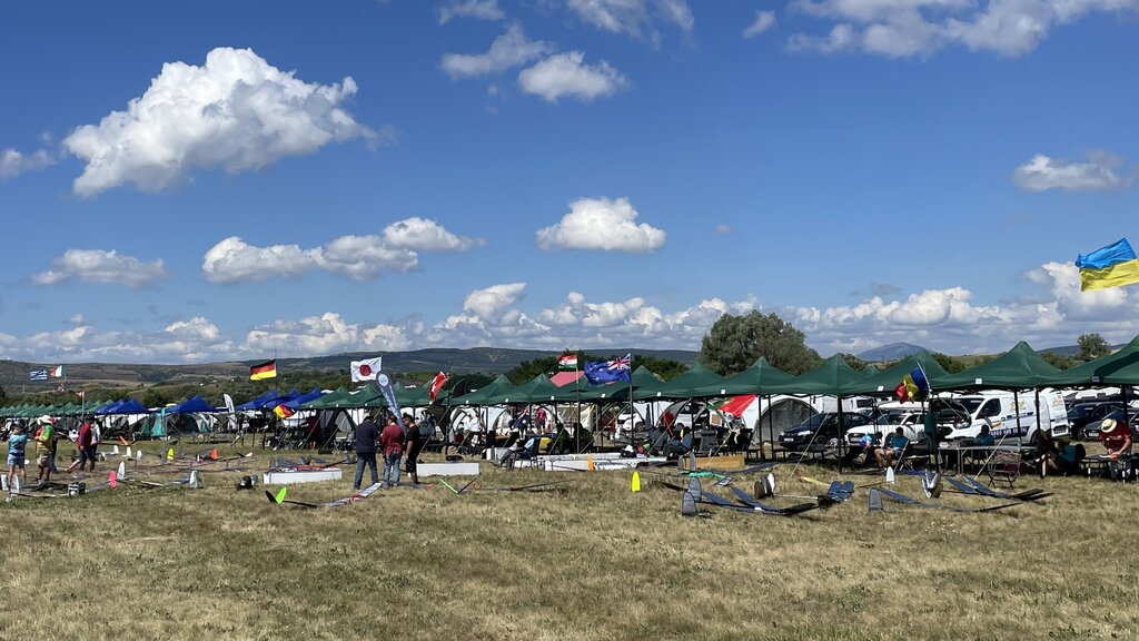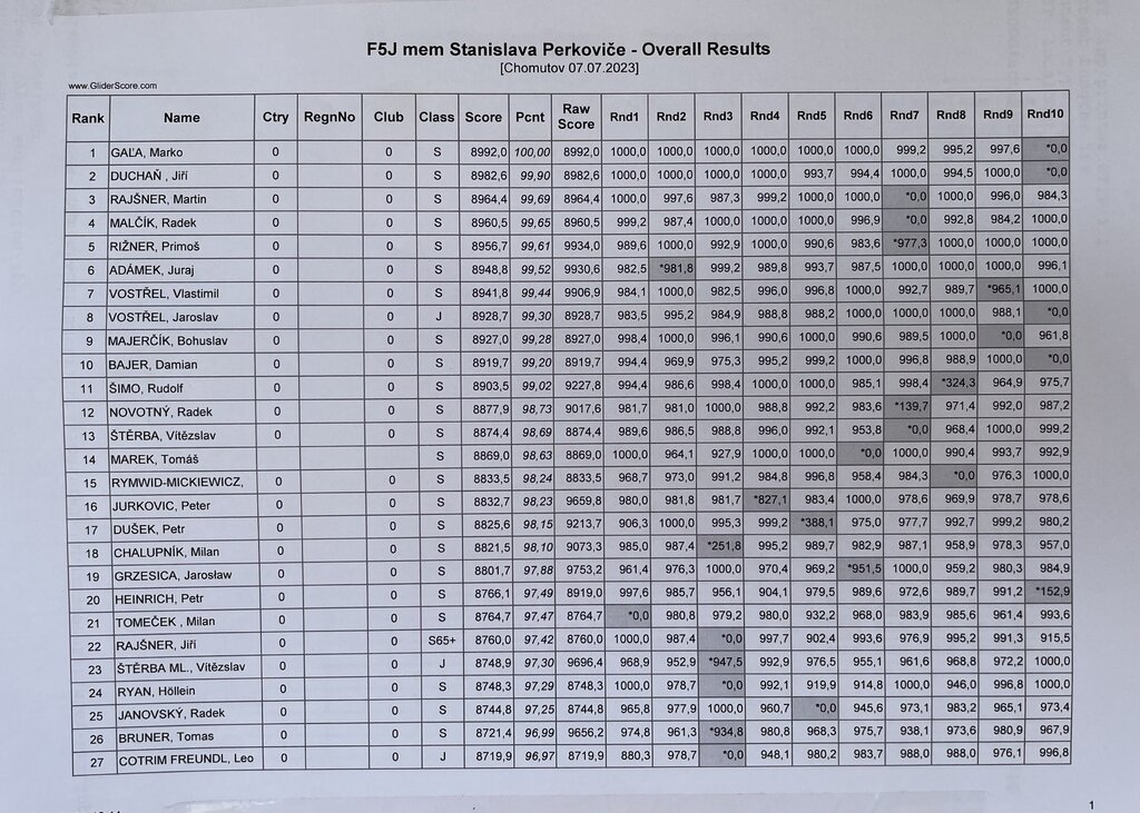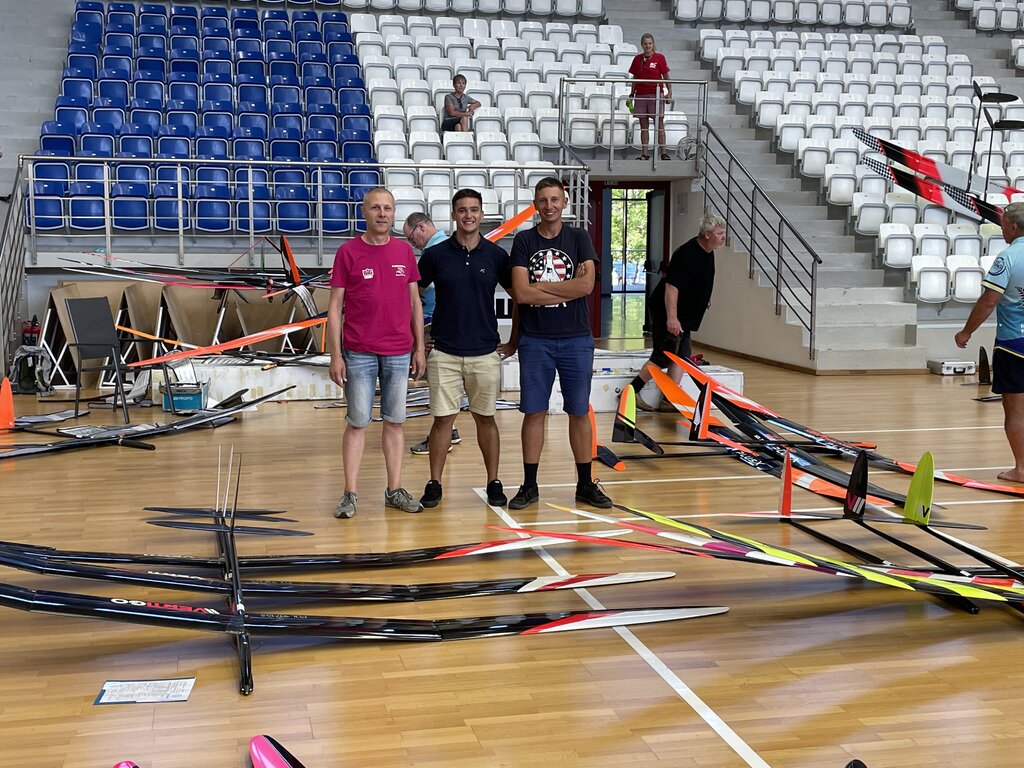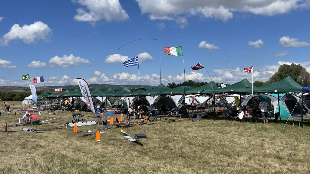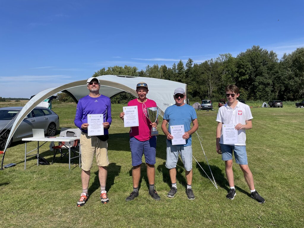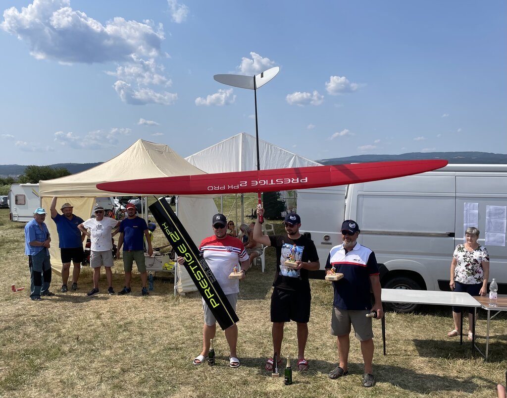 wrzucę jeszcze pełne wyniki rund oraz jaki fajny jest teren lotniska w Chomutovie. I oczywiście zwycięzów Byliśmy tam pierwszy raz i myślę, że wrócimy z przyjemnością, bo organizacja świetna, rozegranie 10 kolejek po 6 grup to bardzo dobry rezultat dla organizatora. Wszystkie rundy szły smukle mimo niemiłosiernego upału. Miało to oczywiście przełożenie na warunki terminczne, co widać po wysokościach startów Wyniki rund można zobaczyć na gliderscore/online score. Wyszedł super trening na niskim lataniu i wszyscy mocno obniżyliśmy starty. Jarek zrobił w bodaj w 9 rundzie 21m, mój najnższy to 38m. Konrad i Ryszard także starali się nisko i wychodziło Fakt, że można było jeszcze bardziej zaryzykować i Damian mnie packał po kostkach różczką, żeby nie podbijać. Ale dopiero po locie, kiedy model zabrało na 750m i lot stawał się nudny, można było szczerze powiedzieć - można było wystartować niżej Damian dzielnie walczył w finale, co mogłem obserwować z perspektywy helpera. Pierwsze 30s i momenty trafienia w termikę były za każdym razem najbardziej emocjonujące. Plan gry był zrealizowany, jednakże z uwagi na przechodzące dynamiczne termiki trudno było zapiąć lądowania w punkt. Będzie to trudno potrenować przed WCH w Bułgarii. Trzeba dodać, że wieczorami bardzo wesoło było posiedzieć w towarzystwie polsko-czeskim.