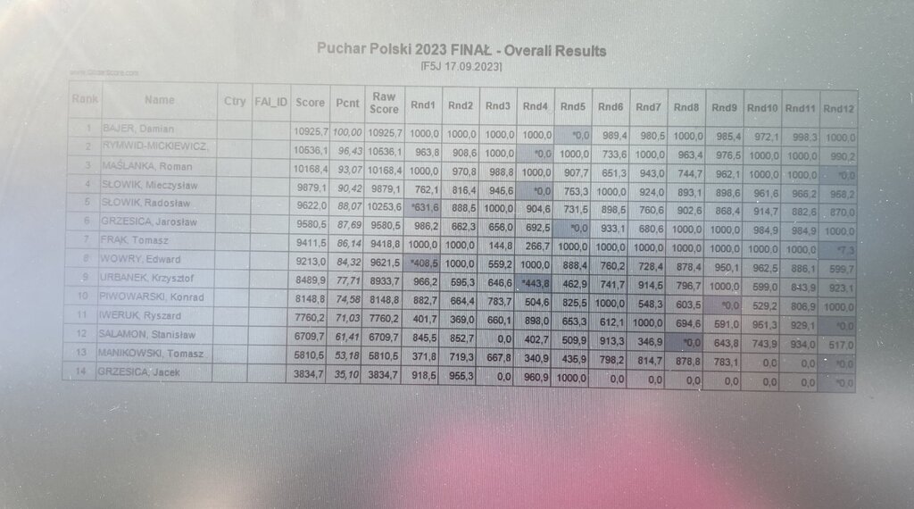 Czas na podsumowanie ostatniej imprezy F5J sezonu 2023, czyli Pucharu Polski w Mirosławicach. Przebojem zwycięstwo wziął Damian O drugie i trzecie miejsce trwała zażarta walka w 12 rundach. Już na początku zapadła decyzja o nie rozgrywaniu finałów, tak aby faktycznie wszyscy zawodnicy mogli rywalizować do samego końca - to był trafny strzał. Pogoda została zamówiona, więc można było swobodnie korzystać z dobrodziejstw okolicznego lasku na kierunku wschodnim. Tym razem ze względów bezpieczeństwa mieliśmy wyznaczoną strefę na kierunku południowym. Pierwszy dzień obfitował w karkołomne latanie nad samymi drzewami, przy czym rządziła nie tylko fala, ale odchodzące termiczne bąbelki, które pozwalały wybijać się dalej na zachód także nad lasem. Wiaterek 3-5ms - więc chodziły średniaki i pod koniec dnia lekkie modele z balastami. Kolejki szły zgrabnie, z przerwami po pełnych dwóch runach. Nim się wszyscy obejrzeli a już zrobiła się 18.00 i w zasadzie całkowita flauta, słońce nad horyzontem, więc Konrad zarządził koniec dnia. Drugi dzień zapowiadał się ze słabym wiatrem, chociaż wiało dalej ze wschodu, stąd lasek był zwykle na początek. Faktycznie siadło dopiero ok 11.00 i zrobiło się bardzo termicznie. Ostatnie 2 kolejki lotów chodziły już z pola pod przechodzące kominki. Niestety w tej edycji zawodów Tomek Mańk. miał ogromnego pecha. Po zderzeniu ze Staszkiem, model spadł do lasu. Nie można go było odnaleźć, ponieważ dostępu broniło znacznych rozmiarów bagnisko. Cóż, być może zimą spróbujemy poszukać modelu i zdjąć go z drzewa. Staszek z lekkim stłuczeniem natarcia ucha bezpieczne wylądował. Jacek, niestety także stracił model pierwszego dnia po lądowaniu modelu z utratą łączności. Damian w punktacji nam szybko uciekł więc, walkę o podium toczyłem najwięcej z Romkiem i Tomkiem F. Było blisko w punktach i trzeba było się pilnować na wysokościach startów. Tym razem miałem więcej szczęścia, a nietypowe przygody w ostatnim locie miał i Romek, i Tomek F. Ostatecznie to właśnie Romek wskoczył na pudło Kończąc sezon 2023 mieliśmy bodaj po raz pierwszy okazję podsumować Puchar Polski F5J. Odbyły się trzy konkursy pucharowe i po podliczeniu Puchar Polski F5J za 2023 zdobył Damian , który w tym roku miał świetne rezultaty, nie tylko w kraju ale i zagranicą, 2-miejsce zajął Mieczysław i 3-miejsce Roman - Gratulacje Panowie !!! Najważniejsze w tym sezonie jest to, że mamy młodego Juniora Radka, który świetnie lata i jest naszą ogromną nadzieją w kolejnych edycjach pucharów w PL i na arenie międzynarodowej. Świetna robota Radku! I tym razem dopisała koleżeńska atmosfera i doskonała rywalizacja. Szczególne podziękowania dla Zeni za pyszne wypieki i dla Konrada za organizację tych zawodów, także tych które już zostały rozegrane we Wrocławiu.
