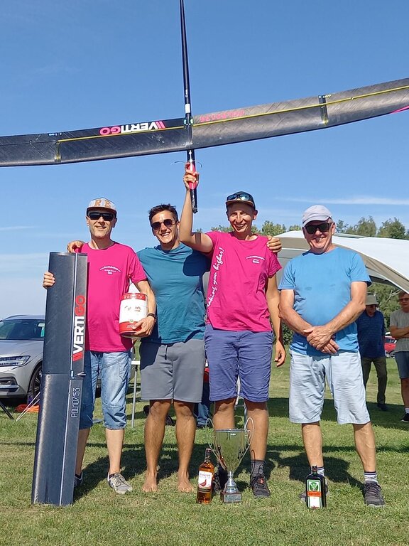 W telegraficznym skrócie: zawody w Kiskunfélegyháza to był strzał w dziesiątkę. Wiele wcześniej słyszałem od Tomka F i Wojtka B. że na Węgrzech (dawnej w Kecskemet) jest super atmosfera i fajne latanie. Potwierdziło się w 100% i było warto mimo 9h w drodze. Organizacja przez Imre "Jimiego" Kaszab była fantastyczna. Lotnisko to prawdziwa patelnia, bez jakichkolwiek przeszkód. W pierwszej części zawodów nie miało to znaczenia, ale sobotę w czwartej kolejce podniósł się nagle wiatr 4-5ms i został z nami do końca w niedzielę. No cóż, był prawdziwe latanie termiczne... żadnych fali, zboczy. Zwykle 8 osobowa grupa startująca dzieliła się dwie, trzy podgrupy w powietrzu. Jedna dolatywała, dwie nie lub prawie tu warto było zamówić sobie trochę farta. Ja byłem w niedziele w deficycie. Ponieważ w sobotę wieczorem przechodził przez południowe Węgry ogromny front burzowy, to wiatr i termiki były kapryśne. Powietrze się kotłowało i było sporo wilgoci, co dawało efekt sauny. Dziękuję Jarkowi, za pożyczkę colemana - bez niego byśmy z Tomkiem się rozpłynęli. Tomek walczył w kolejkach - jedna dobra, druga ... hmm. W końcu się przełamał i na drugi dzień z 7 lokaty wszedł do finałów. U mnie początek nerwowy. Dwa pierwsze loty zacząłem relatywnie nisko, ale spadałem do 10-12m. Na szczęście, dobre oko Tomka podpowiedziało bąbelki a mi udawało się je wykorzystać - oba loty doleciałem Początek choć z miękkimi kolanami zapowiadał się nieźle. Później wiatr zaczął siać spustoszenie w wynikach. Pierwszy dzień zakończyliśmy na dobrych miejscach wyjściowych pod finały. Jeszcze tylko dwa loty w niedzielę... Po mega burzy w nocy, lotnisko w niedzielę było nasączone wodą. Poranny trening zapowiadał termikę wszędzie. Każdy lot treningowy łapało z 20-30m, po prostu izzy, w tym 1,5kg model. Niedzielę otwierałem 1 lotem i zapowiadało się dobrze. Grupa bezpiecznie poszła kontrolnie pod 120m. Ja 134m więc spox. No i kicha. byłem w podgrupie 3 model. Niestety wszyscy kolektywnie spadliśmy. Inne podgrupy w innych lokalizacjach dały radę. A my szliśmy na pewniaka pod ptaka.... Pierwsza rosa odparowała na treningu a było za krótko słońca, żeby ruszyło silne noszenie od ziemi. Tomek miał więcej szczęścia, bo leciał później i taktycznie grupa poszła dużo wyżej. Ostatni loty Tomek trafił, ja nie trafiłem. Wyszło 5min z 200m Wygrał rundę Buguś 7min i 180 m. No i u mnie było po finałach. Przed finałami po lunchu pogoda się ustabilizowała - słońce i regularny wiatr. Finały zaczęły się dobrze. Model Tomka trafił podczas staru no ok 70-80m w silną turbulencję i po chwili było wiadomo, że jest w kominie. Poszedł z nim w kosmos. Zabrali się Adam Buzas i Słowak Rudolf Simo. Pozostali spadli po 2-3 minutach. Nie obyło się też od spirali śmierci u Bugusia ze Słowacji - chyba utrata sygnału. W drugim locie szacowaliśmy, że trzeba już uważać na tych dwóch i złapać bezpieczną wysokość do dolatania 15min. Ten drugi parametr był kluczowy. Tym razem nadszedł komin i udało się z nim zabrać. W tym locie dolatali Imre i Juraj, ale pierwszy lot mieli stracony, Adam i Rudolf spadki wcześniej, więc pozycja z kalkulatora mówiła, że trzeba trzeci lot "po prostu" dolatać i będzie pudło pewne. W ostatnim locie początek był bezpieczny. Wysoko, i odejście w kominie. No ale tak bywa trzy razy się to samo nie zdarza. Zaczęły się problemy z powrotem po wiatr Padła decyzja na powrót i odpuszczenie krążenia. Jednak model 1,7kg nie zamierzał wracać. Na podejściu duszenia i zaczęły się nerwy, że model nie doleci. Mocno dociśnięty do trawy wrócił, ale zabrakło do taśmy. Na szczęście zmieścił się w 75m i 9/15 min lotu. Wystarczyło Taktycznie Tomek rozegrał to wyśmienicie Pierwsze zawody Tomka w tym sezonie, więc wywalczone w stylu w pełni zasłużenie. Bardzo fajne spotkanie i pogaduchy ze Słowakami i Węgrami przy darmowym piwie. Jimmy zadbał o to, żebyśmy nie byli głodni i mieli zawsze pełny kufelek Zdjęcia zwycięzców wrzucił już Damian, więc załączam zdjęcie z lotniska. Dla zainteresowanych na przyszły rok, warunki sanitarne w pobliskim aeroklubie też są zapewnione.