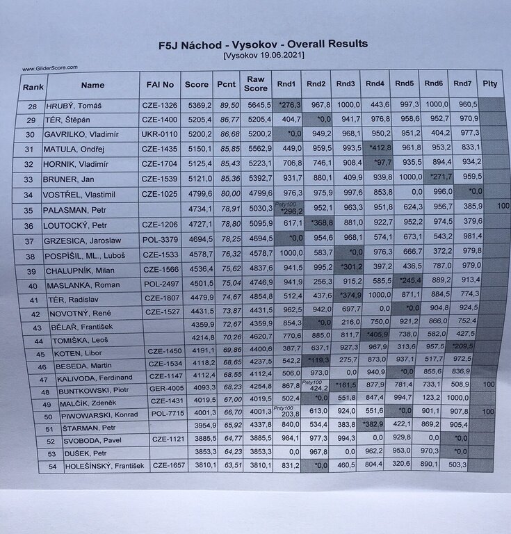 Konrad, napisałem już do Organizatora. Jeszcze się nie odezwał. Z wyników widać, że zawodnicy byli w różnych strefach pogodowywych http://www.gliderscore.com/OnLineScores.aspx Moje dziejsze loty - nie byłoby wstydu , ale też miałby 2xzerko, bo ryzykowałem. Moja pogoda 8 stopni, słońce z zachmurzeniem, potem słońce, wiatr 5ms + podmuchy do 7ms, potem 6 ms + podmuchy 8ms (mierzone przyrządem). Model 1,8kg było mało. Zimno (kurtka zimowa ), Nosiło