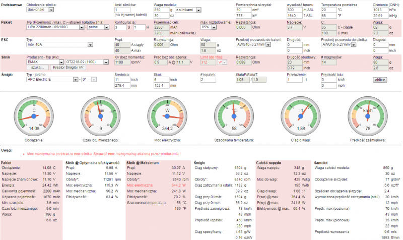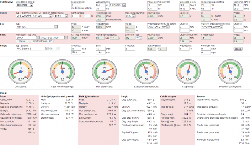 Załączam zdjęcia z kalkulatora Ecalc, który pięknie wyliczył mi wszystkie parametry. Wygląda na to, że będzie idealnie przy śmigle 10x6E. I jeszcze ciekawy patent: Jeśli nie macie licencji i nie macie możliwości wyboru waszego silnika, wystarczy odświeżyć stronę kilka razy aż wasz będzie dostępny Śmigło 10x6 Śmigło 11x6 Śmigło 11x4.7