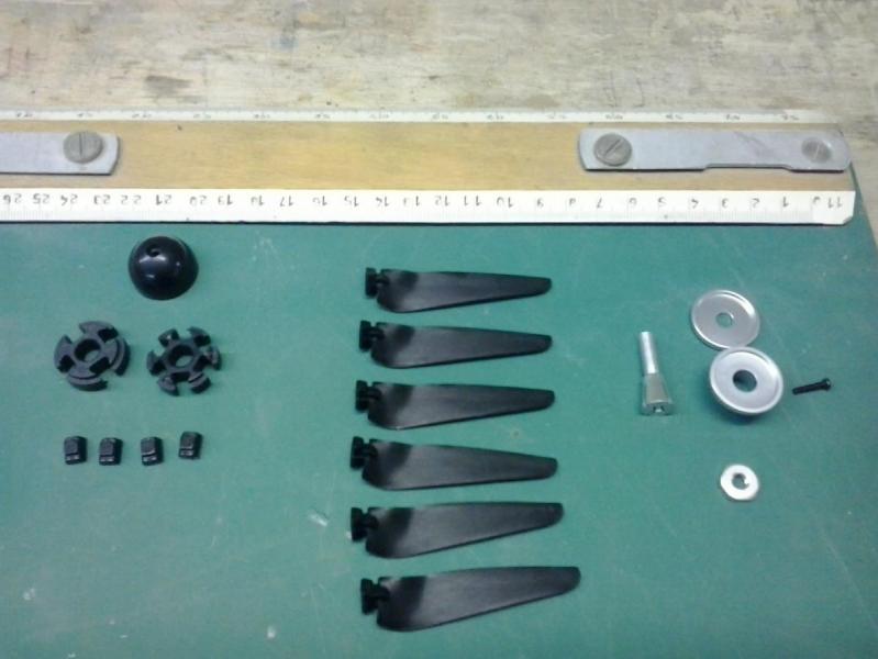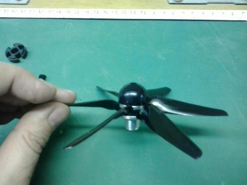 Dziś dotarło śmigło - woreczek, w nim 3 woreczki i sporo części. Wszystko ładnie wykonane, z wyjątkiem samych łopatek - mają bardzo brzydkie wypływki na krawędzi natarci, wielkości ok 0,3mm, więc na dobry początek wymagały delikatnego obcięcia skalpelem i przetarcia. Łopatki malutkie - 55mm długości - mają spore wygięcie u nasady i małe na końcach. Sklep i producent nie podają skoku, ale na łopatkach jest wtłoczone 5x5. Po złożeniu waga 6-cio łopatowego zestawu z kołpaczkiem wynosi 15g. Średnica 5" świetnie pasuje do tunelu mojego "grubaska" - odstęp od ścianki 2 do 4 mm Mam nieodparte wrażenie, że wbrew opisom, ten produkt ze względu na średnicę, wagę oraz ilość i kształt łopatek, nie nadaje się do żadnych makiet (makietek), ale jest wręcz stworzony do napędu tunelowego. Czekam na silnik, aby przetestować cały układ - ciągle mam nadzieję, że przeczucia co do jego wydolności mnie nie mylą. Swoją drogą - trzeci dzień przekopuję Internet, ale poza sklepem ABC nie znalazłem o tych śmigłach ani słowa - googlac nie umiem, czy to taki unikat ? W międzyczasie wykombinowałem inny wariant napędu steru wysokości, tak aby dźwignia była w osi steru, a serwo trafiło pod "brzuszek" koło Aku.