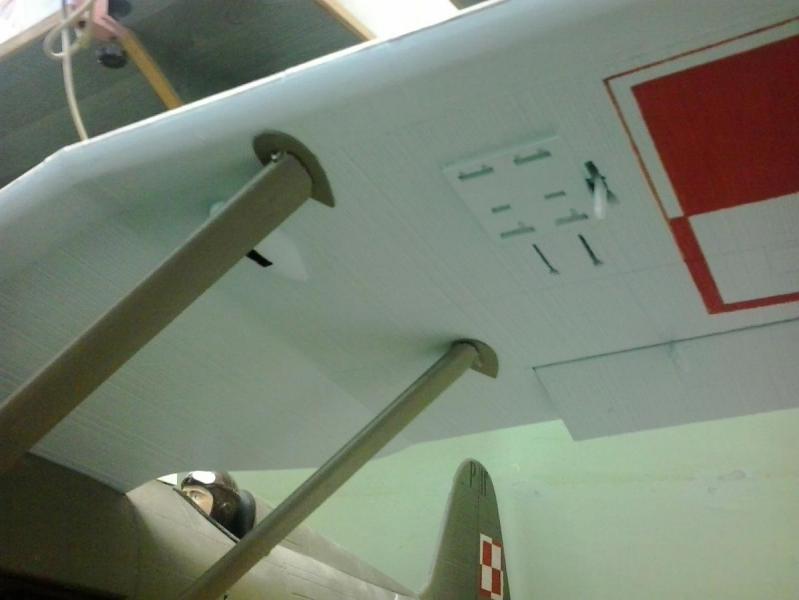 Dzięki za miłe słowa. W tej chwili napęd stanowi EMAX GT2215/12 KV900 ze śmigłem 11x3,8 Statycznie dla takiego zestawu zmierzyłem ponad 850g ciągu, a więc powinien ładnie i powoli latać (jak przystało na rasowy przedwojenny myśliwiec) Wcześniej był chiński czerwony no-name- teoretycznie o tych samych parametrach, ale niezależnie od użytych śmigieł nie wycisnąłem z niego więcej niż 650g. Ponieważ "makietowe" śmigło powinno mieć 12" więc musiałem zainwestować w nieco porządniejszy silnik, bo szkoda by było rozbić ślicznotkę w pierwszych lotach z powodu niewydolnego napędu. Reszta bebechów, inaczej niż w pierwowzorze, ulokowana w komorze wygospodarowanej w górze i nosie kadłuba - pod skrzydłem, które jest zdejmowane i dzielone - stąd te "śrubunki" przy zastrzałach. -