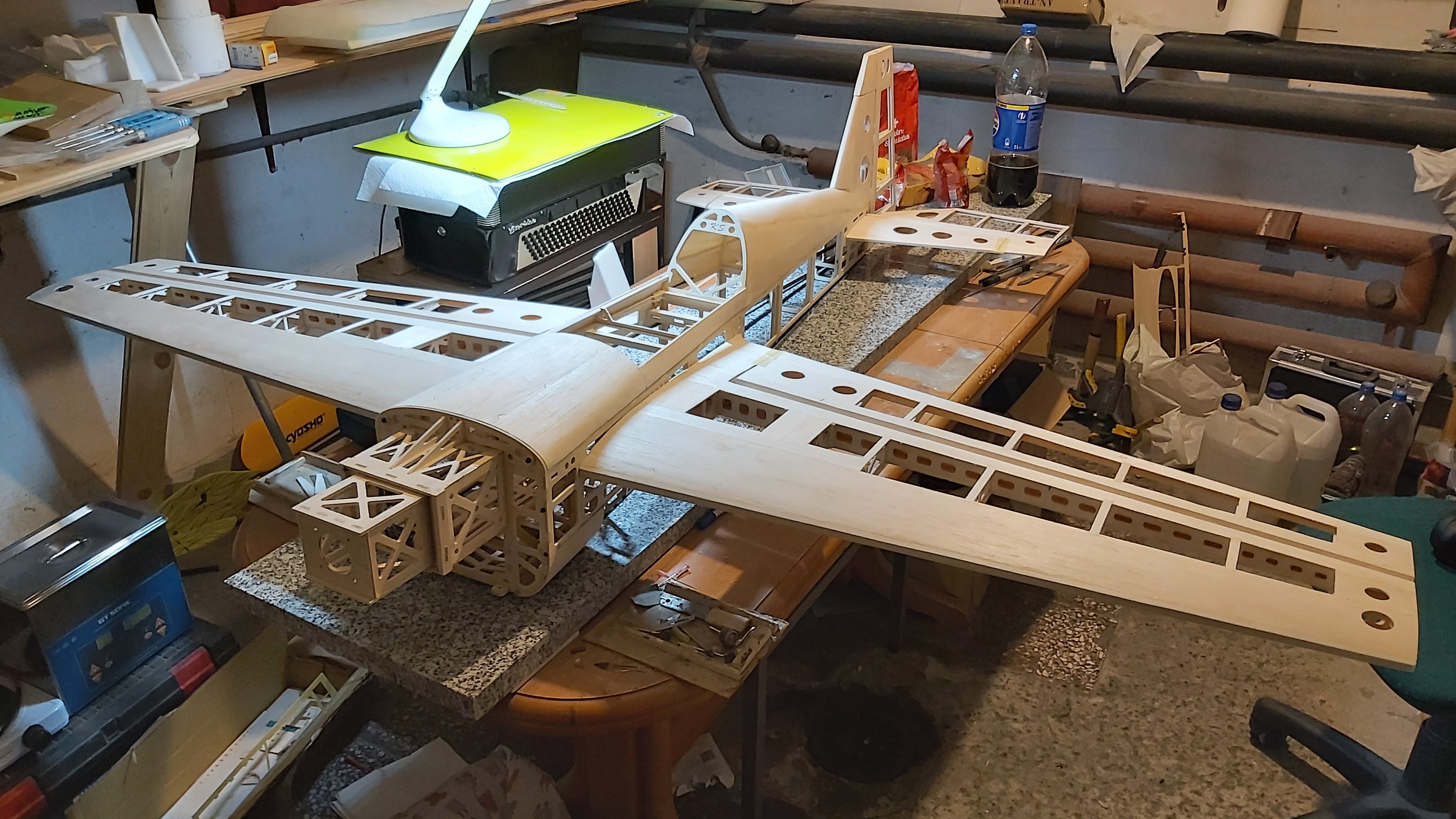enter1978 Opublikowano 20 godzin temu Autor Opublikowano 20 godzin temu Dopadł mnie etap szlifowania itp , nie było co pokazywać ale prace systematycznie posuwały się do przodu. No i dziś udało sie skończyć cięcie listew w trójkąt na spływach skrzydeł i natarciach lotek , i w ogóle odcinanie naddatków i szlifowanie juz jest za mną. Niby jeszcze natarcia nie sa pozaokrąglane , ale to już jest drobiazg. Ogólnie jeszcze zostało takiej dłubaniny że się robi i nic nie widać żeby było coś zrobione, ale juz bardzo mało takich prac zostało, np ster kuerunku nie ma natarcia i nie ma spływu ale natarcie z listwy trójkątnej ma , nie ma zamontowanych nakrętek kłowych i takie pierdoły juz zostały do zrobienia , ogólnie model na ukończeniu , trzy wieczory i będzie gotowy pod folię , maska i szyba już się robi bo zostały zaprojektowane juz jakoś czas temu , i pewnie niedługo przyjdzie razem z zatrzaskami skrzydeł. Ale na razie muszę zrobić przerwę bo zobowiązania mnie trochę gonią , jak zrobie co poobiecywałem ludziom to model powróci na tapetę. 3