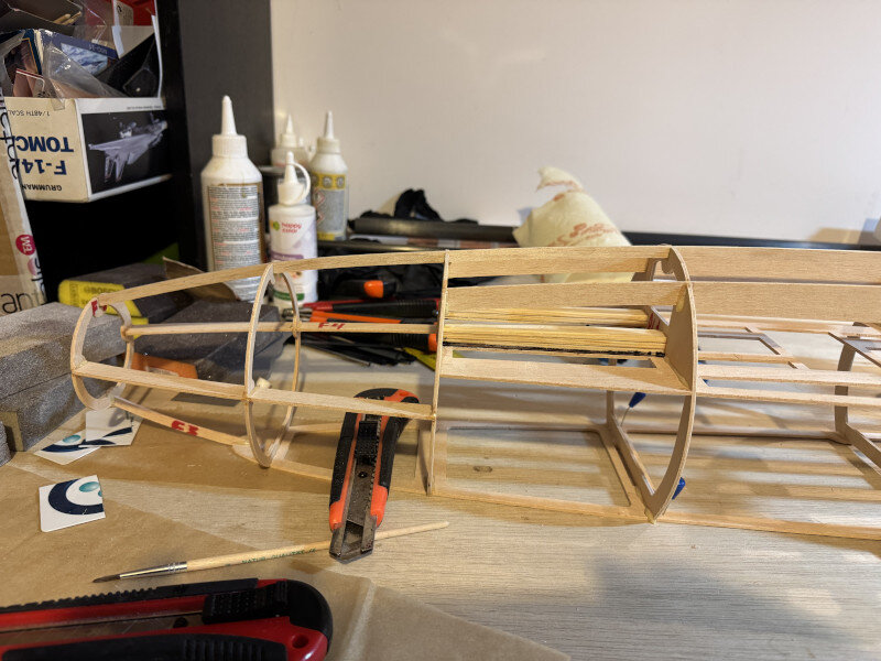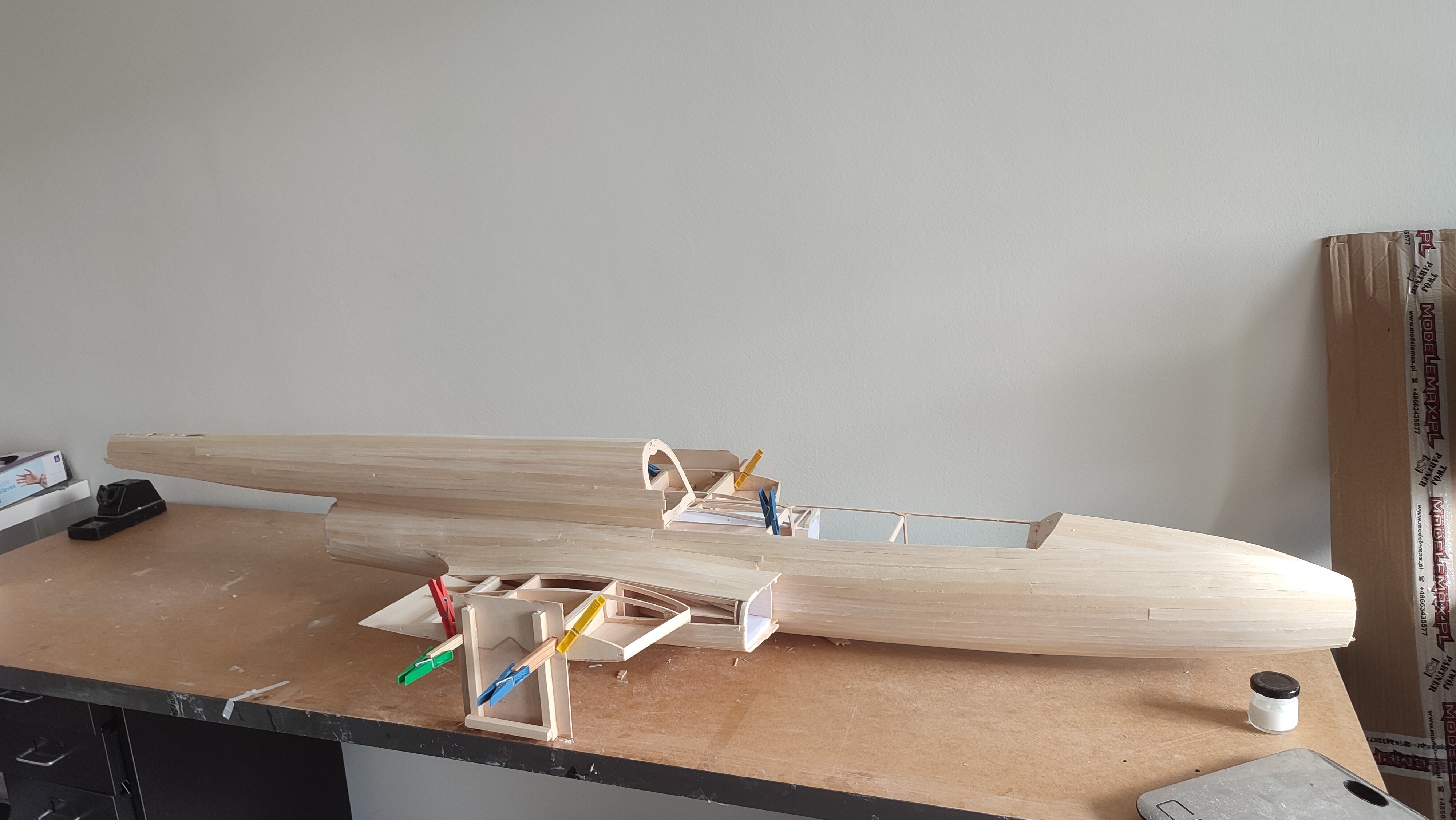 Ta odpowiedź cieszy się zainteresowaniem. Viper Opublikowano Czwartek o 20:42 Autor Ta odpowiedź cieszy się zainteresowaniem. Opublikowano Czwartek o 20:42 Pięknie Patryk wytłumaczyłeś, ja też dziękuję. Co prawda mi to mówiłeś, ale ja jestem wzrokowcem, jak przeczytam to bardziej do mnie trafia. Acz ja podobnie robię na soudal, nadal jako leń, nie chce mi się żelazkiem machać Smaruję krawędzie balsy soudalem, patyczkiem do sushi, z jednej strony mam zaostrzoną łopatkę do większych powierzchni, z drugiej zaostrzony koniec, lub patyczkiem do szaszłyków, staram się cienko, kładę na papierze do pieczenia, kawałkiem ręcznika papierowego zabieram nadmiar, z góry kładę kolejną warstwę papieru do pieczenia i obciążam, trochę dłużej, ale też pięknie i równo łapie. Dziś bardzo niewiele, ale jak zaznaczyłem na wstępie traktuję trochę tę relację jako element mobilizujący, więc się zmobilizuję Przed wyjściem do pracy namoczyłem prostopadłościan balsowy 3x6x1000mm w miejscu oczekiwanego wygięcia płynem do spryskiwaczy i jak był juz solidnie wilgotny w rękach delikatnie zacząłem wyginać, aż jak już wygiąłem odpowiednio wasadziłem w rowki we wręgach kadłuba w linii pośrodkowej i przymocowałem ściskami by wysechł i złapał odpowiednią krzywiznę. Dlatego tak a nie na siłę na CA? Bo szczególnie pierwsze trzy wręgi są trochę zawieszone w powietrzu na delikatnym stelażu i wszelkie wyginanie na siłę spowodowałoby utratę geometrii, a po ludzku skrzywienie i skręcenie, a dwa że siłowe rozwiązania mogą skutkować pęknięciem balsy. Dlaczego się bawiłem, a nie dociąłem odpowiednich fragmentów i wkleiłem pomiędzy kolejne wręgi, bo krzywizna kadłuba jest łagodnie załamana, a nie składa się z kątów. Tak wyglądało to suszenie/kształtowanie po położeniu na płycie montażowej po przyjściu z pracy wieczorem. A tak po wsadzeniu na swoje miejsce na modelu, krzywizna kadłuba zachowana, żadnego zniekształcenia (skręcenia/skrzywienia) nie ma, można kleić, co i zrobiłem 5