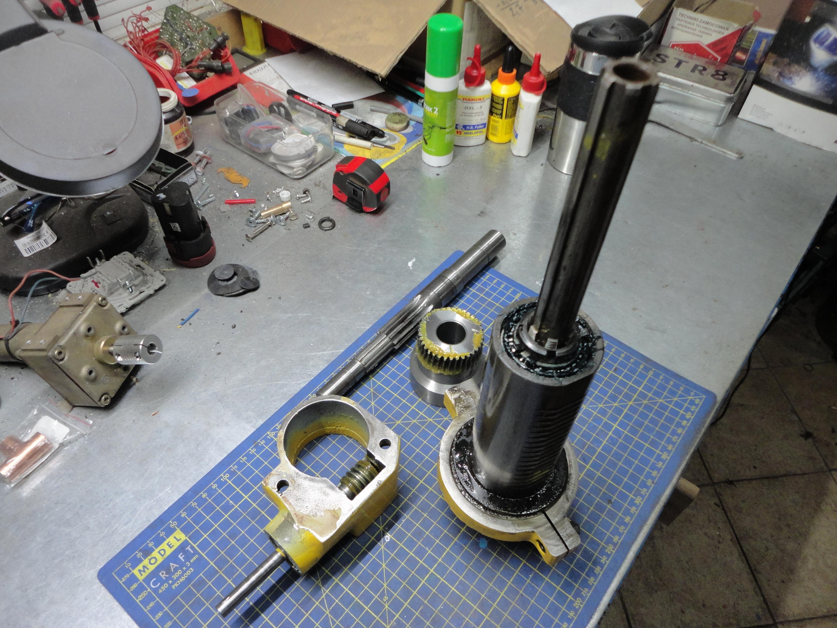 rosik Opublikowano 3 godziny temu Opublikowano 3 godziny temu WITAM Kolejny projekt z mechaniki, który zamierzam zrealizować. Chodzi mi po głowie już ładnych kilka lat. Ale do rzeczy. Przez lata zgromadziłem sporo różnych podzespołów które mogę wykorzystać do budowy takiej maszynki. Z początku wszystkie posuwy myślałem zrealizować na prowadnicach liniowych (posiadam używane ,,REXROTH,,), ale ostatecznie tylko oś ,,Z,, ma pracować na w/w prowadnicach a osie ,,X,, i ,,Y,, ma zastąpić stół krzyżowy: Wiadomo stolik ten jakością ,,d**y,, nie urywa, ale myślę że po niewielkich modyfikacjach będzie spełniał swoje zadanie. Chociaż w przyszłości wykonam może drugi stół ale na prowadnicach liniowych i z większymi zakresami posuwów. Posiadam też taki oto wałek wrzeciona ze stożkiem ,,Morse'a 3,, do jakiejś chińskiej mini frezarki. Wymiary wałka podaję na załączonym rysunku (sorki że rysowany na szybko ręcznie). Znalazłem jeszcze u siebie oprawkę na tulejki ER32 oraz sporo różnych frezów do metalu. Byłoby żal tego nie wykorzystać. ku A oto taki szybki rysunek do łożysk skośnych (kolor żółty). Na rysunku kasowanie luzu poprzez koło pasowe i niewielki pierścień nakrętką z lewym gwintem M27x1,5 No i teraz przechodzimy do sedna. Otóż wykonanie wrzeciona na wyżej pokazanym gotowym wałku. Chodzi mi o to jaki najlepiej typ łożysk zastosować - stożkowe czy może jednak skośne i jak w ich przypadku najlepiej rozwiązać kasowanie luzów. W przypadku stożkowych myślałem o jednym z przodu wałka i jednym z tyłu. W przypadku skośnych - dwie szt. z przodu wałka i jedno z tyłu. Czy może lepiej dwórzędowe z przodu i jednorzędowe z tyłu? Kolejne pytanie to z jakimi kątami pracy w takim urządzeniu byłyby łożyska skośne najlepsze. Jak je rozwiązać w obudowie wrzeciona odnośnie naprężeń i kasowania luzów. Wiadomo też - tak jak u może większości wolałbym nie generować niepotrzebnych kosztów. Liczę się z tym, że nie uzyskam na niej takich efektów jak na maszynie fabrycznej, ale myślę że warto spróbować. Wiem, że są obecni na tym forum Koledzy którzy posiadają niesamowitą wiedzę w temacie mechaniki i może zechcą się nią co nieco podzielić? Kiedyś popularne było takie powiedzenie ,,POMOŻECIE,,😉? Z góry dziękuję i pozdrawiam. Grzegorz