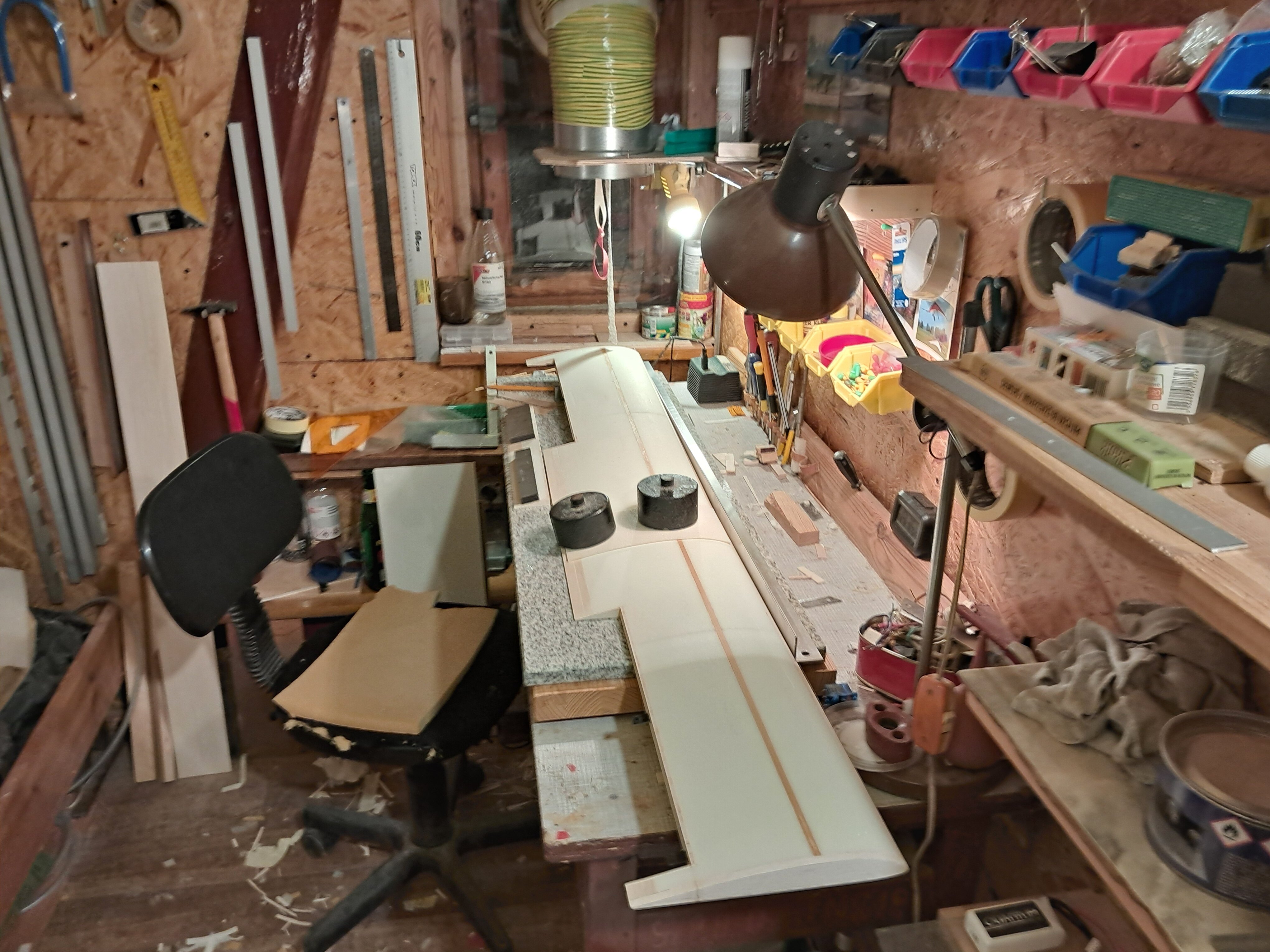 Ares Opublikowano 26 Listopada Autor Opublikowano 26 Listopada Kolejna praca to wykonanie rowka na dźwigar. Ja od dawna nie robię tego gorącym drutem tylko do listewki sosnowej naklejam papier ścierny tak aby sumaryczna grubość listewki i papieru ściernego była taka jak grubość listwy dźwigara. Takim "szuradełkiem" szlifuję przy linijce rowek co można zrobić bardzo precyzyjnie i szybko. Następnie doklejam krawędzie natarcia i spływu. Natarcie szlifuję najpierw zgrubnie w trapez a potem zaokrąglam papierem ściernym. Dokładne wykończenie robię "pilniczkiem "zrobionym z papieru ściernego na nosku profilu: nosek bardzo ładnie wychodzi choć wadą tej metody jest możliwość jej stosowania tylko do płatów o obrysie prostokątnym. Trzeba pamiętać o zabezpieczeniu powierzchni płata tuż za krawędzią taśmą pakową aby nie uszkodzić podczas szlifowania powierzchni płata. Spływ szlifuję do krawędzi stołu dopiero po przyklejeniu. Do klejenia używam żywicy i Poxipolu bo Soudal pomimo swoich zalet puchnąc powoduje czasem deformację elementów. Jutro opiszę odcinanie lotek. Kolejne dni niestety nie pozwolą mi już na codzienne majsterkowanie i dalsze prace przy skrzydełku będę umieszczał mniej regularnie . Reszta czynności jest już stosunkowo prosta ale mimo wszystko opiszę kolejne czynności do końca prac. 1 1