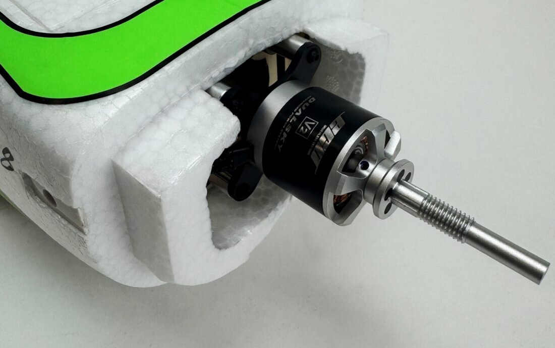 Czy ktoś wie, gdzie można kupić  taki adapter do silnika Dualsky 2820C V2? Prawdopodobnie ułatwia to zamontowanie kołpaka ze śmigłem składanym. Producent dołączył do tego silnika adapter do śmigła stałego z krótszą ośką. Jest opcja zamontowania z odwrotnej strony ale silnik musi być ukryty wewnątrz kadłuba. Ja muszę ten silnik mieć cały na zewnątrz przegrody tak jak na fotce. Jakoś sobie z tym poradzę ale ta wersja dałaby szansę na wykorzystanie kołpaka turbo. Przeszukałem sklepy ale nic takiego nie znalazłem.