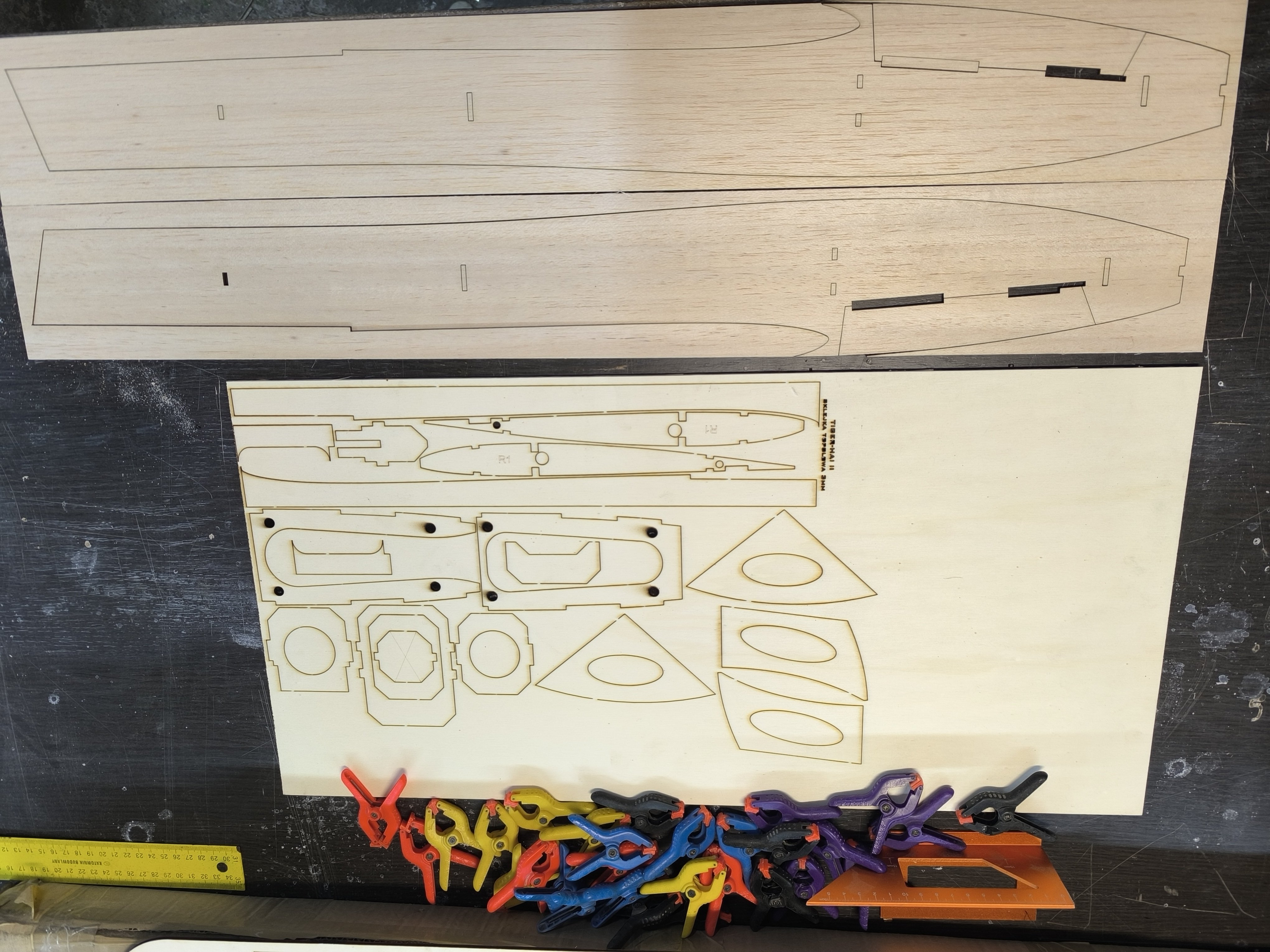 krzysiek.riese Opublikowano 13 godzin temu Opublikowano 13 godzin temu Cześć! Przedstawiam moje poczynania z modelem Higer-Hai II. Jest to poprawiona wersja znanego już od lat modelu. Zmianom uległ kadłub a właściwie jego sposób składania oraz delikatnie kształt. Elementy składowe kadłuba: Najpierw wklejamy magnesy neodymowe 7 X1 do wręgi poziomej oraz wręgi kabiny. Następnie poziomą wręgę oraz wręgę numer 3 ustawiamy na sucho i punktowo w narożniku łapiemy na CA. Później wstawiamy wręgę numer 2 i wyginamy boczki żeby polegały do wczesniej wpasowanych wręg. Całość połączenia zalewamy CA. Następnie kolej na wręgę silnikowa. Grawerem z wyznaczonym środkiem na zewnątrz. Ułatwi to później montaż silnika. Kolejny krok to wręga 4 i 5. Potem kolej na wzmocnienia boczków pod skrzydłami. Te elementy wsuwamy wcześniej posmarowane klejem typu wokół. Zakładamy ściski i odkładamy do schnięcia. Kolej na statecznik. Na początek rdzeń że sklejki lipowej 2 mm wyciągamy z formatki. Następnie nakładki z balsy 1,5 mm naklejamy z obu stron. Można najpierw jednak strona a druga na drugi dzień. Pamiętamy że do schnięcia należy równomiernie docisnąć. 2
