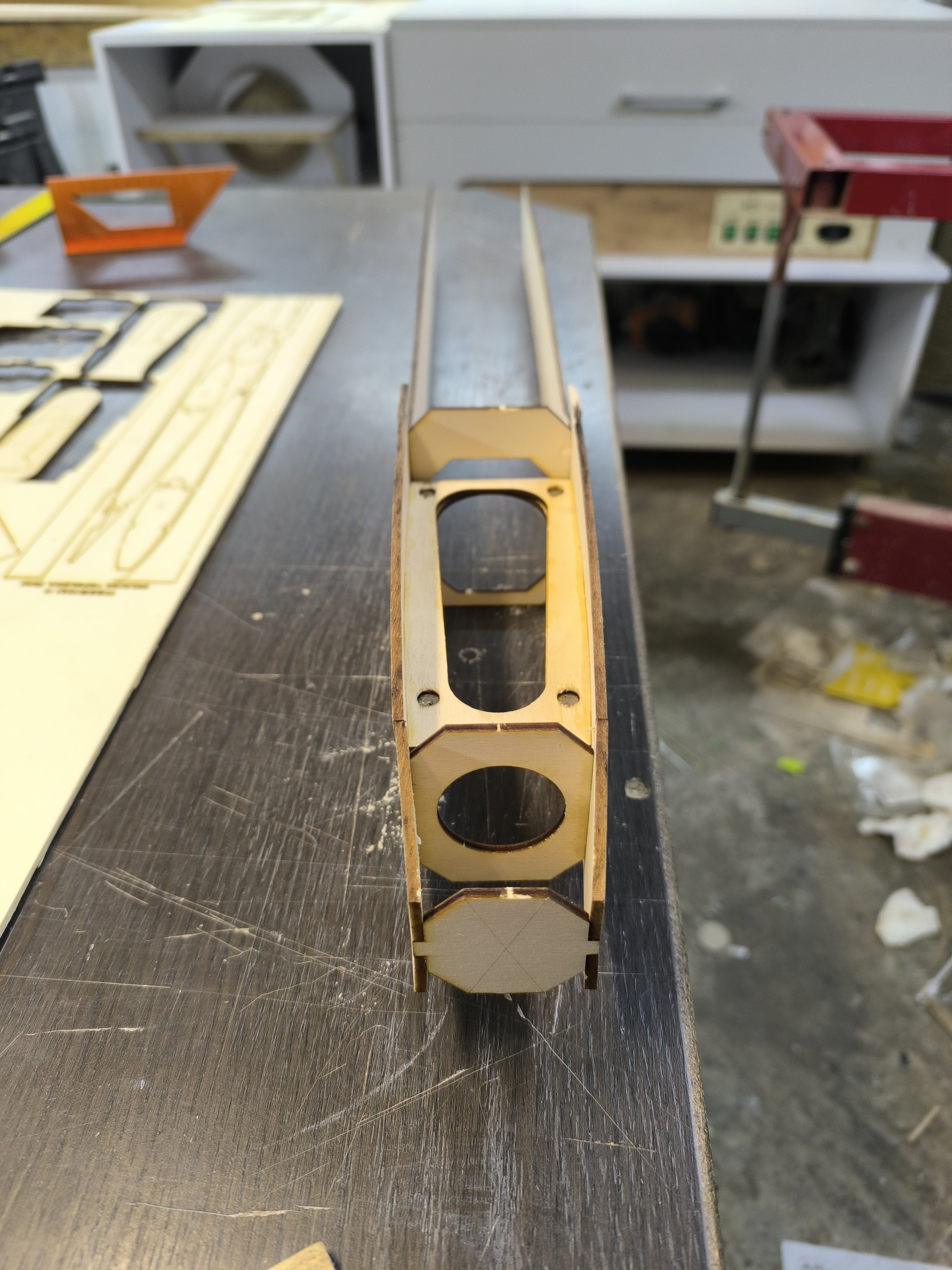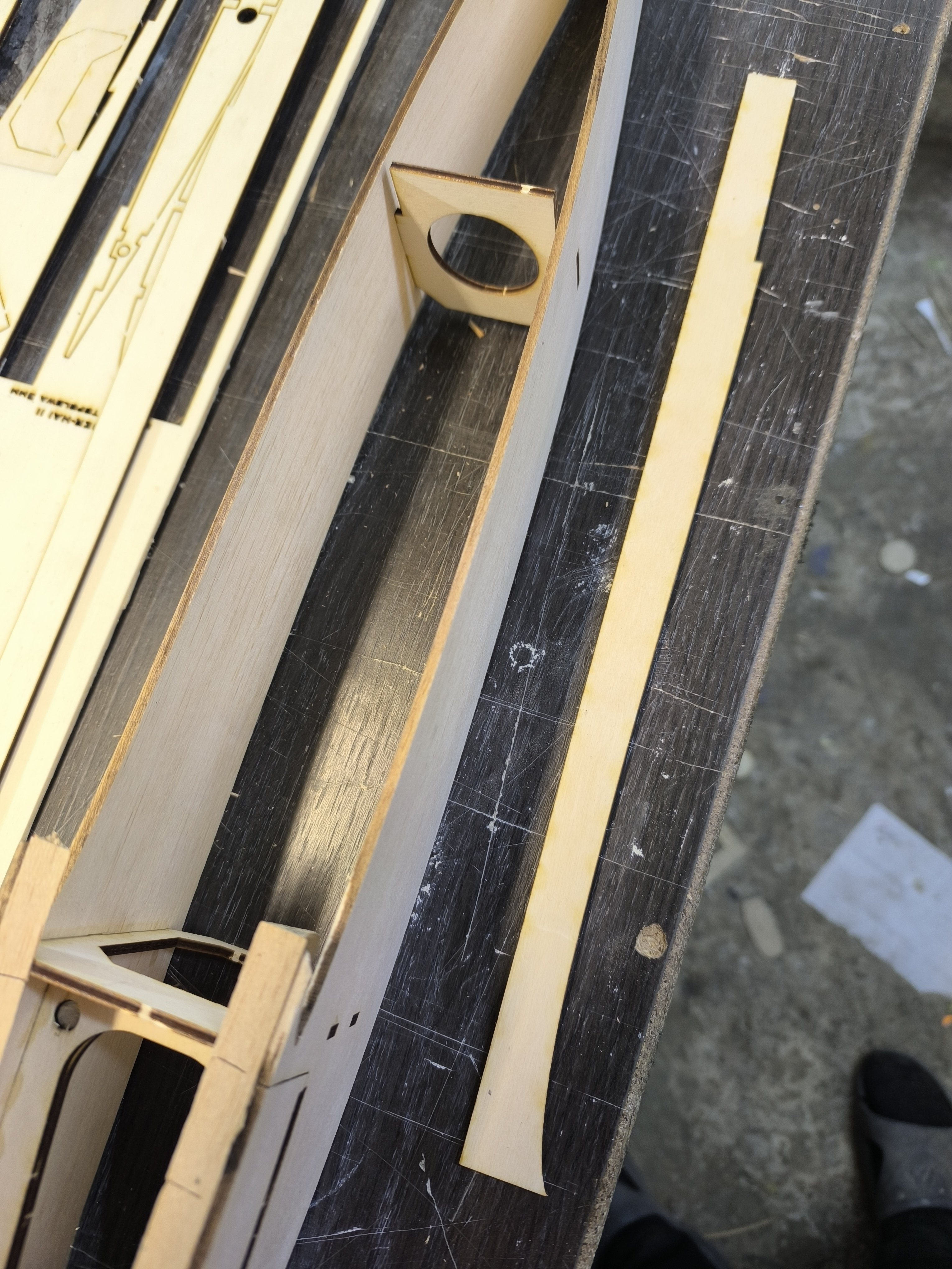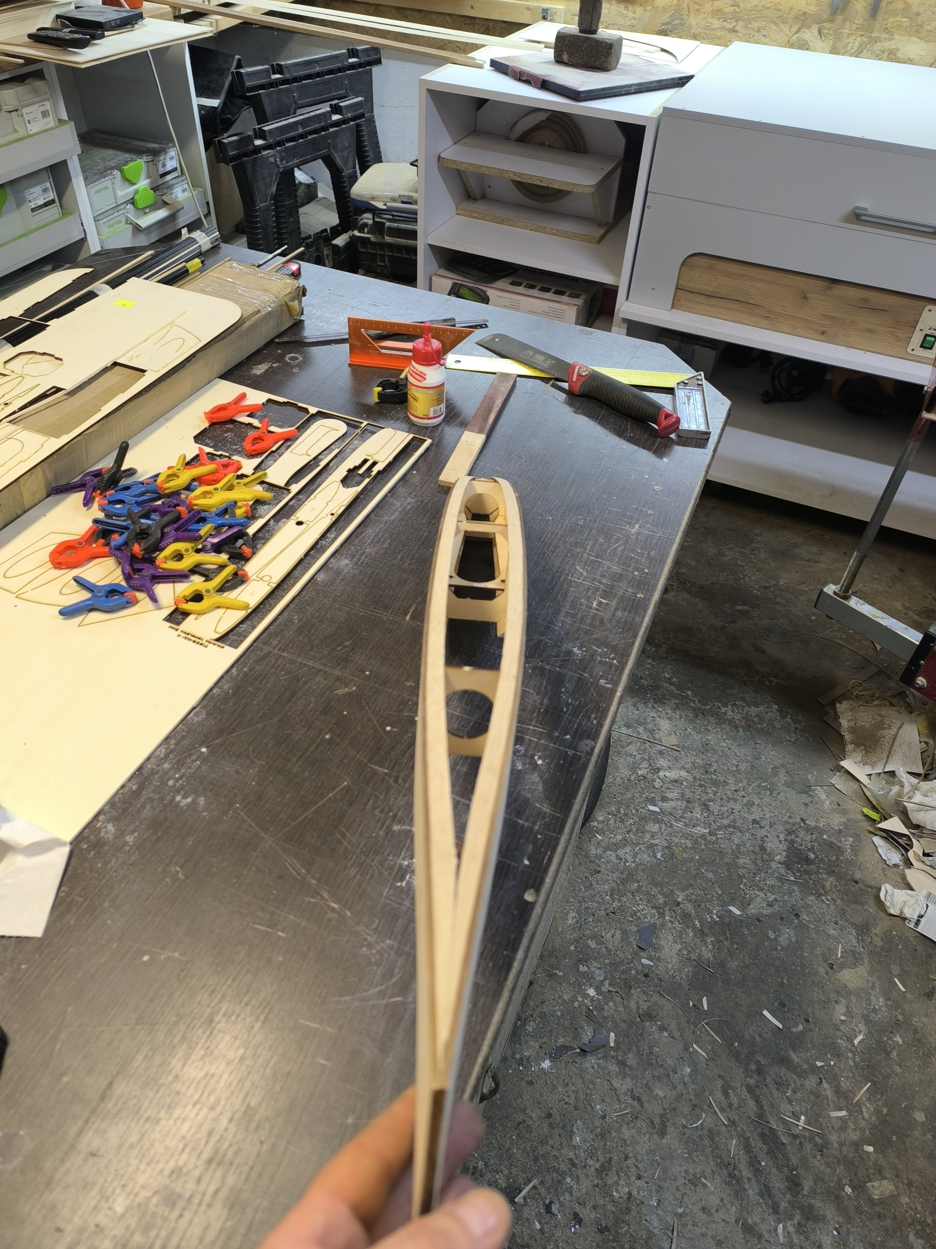 krzysiek.riese Opublikowano 2 godziny temu Autor Opublikowano 2 godziny temu Mały progress. Do kadłuba wklejone listwy trójkątne 10x10. Listwy te trzeba ponacinać żeby ułatwić wyginanie. Listwy wklejone na wikol a miejscami pomagałem sobie na CA. Odstawiamy na 2 godziny do schnięcia i idę na obiad. O oddali laser wycina żeberka oraz heligi. 5 minut temu, dariuszj napisał: A to dziwne, bo prawie wszyscy żałość zalewają alkoholem Hehe dobre ale tu psikusa zrobiła autokorekta. 1