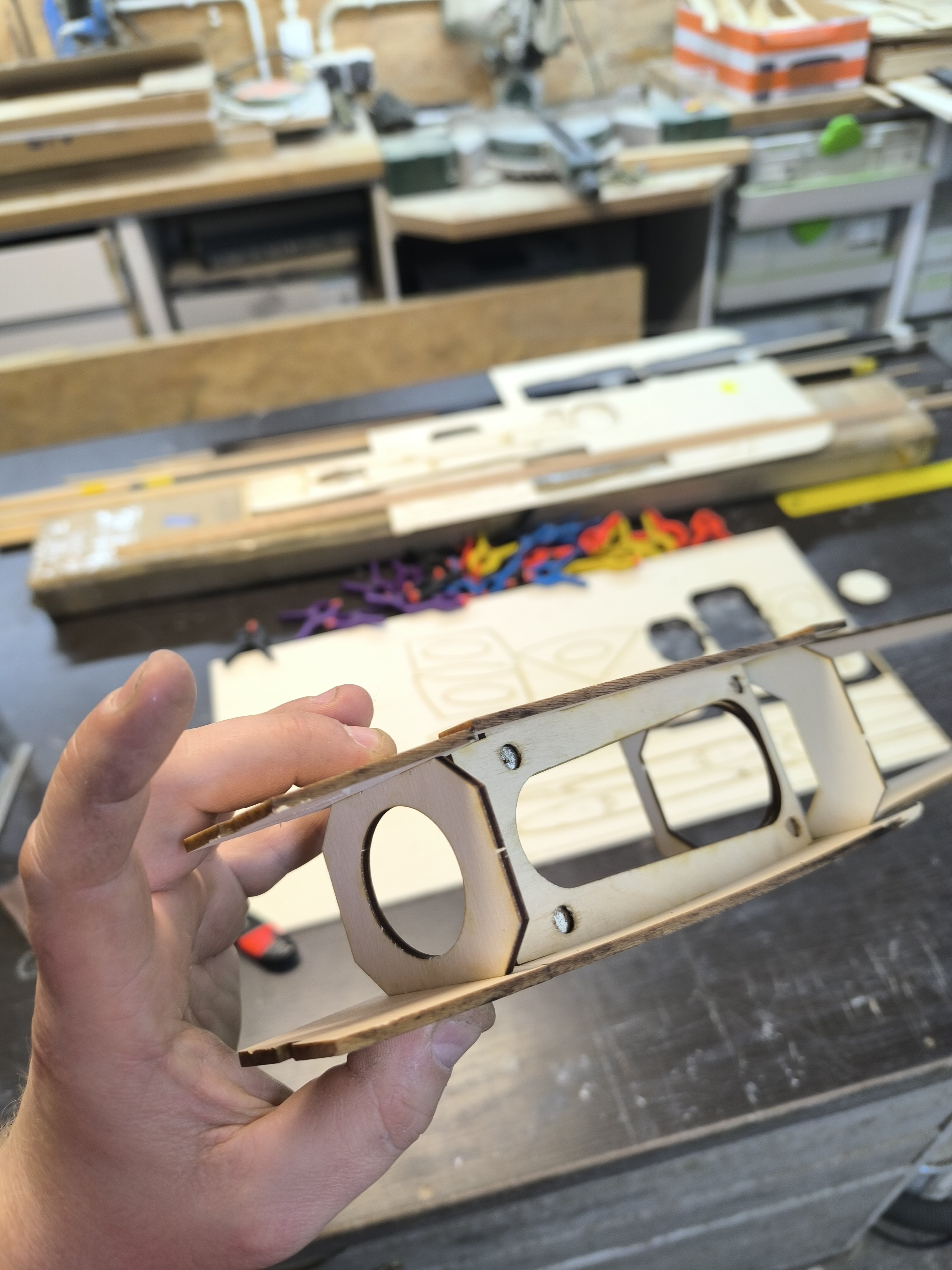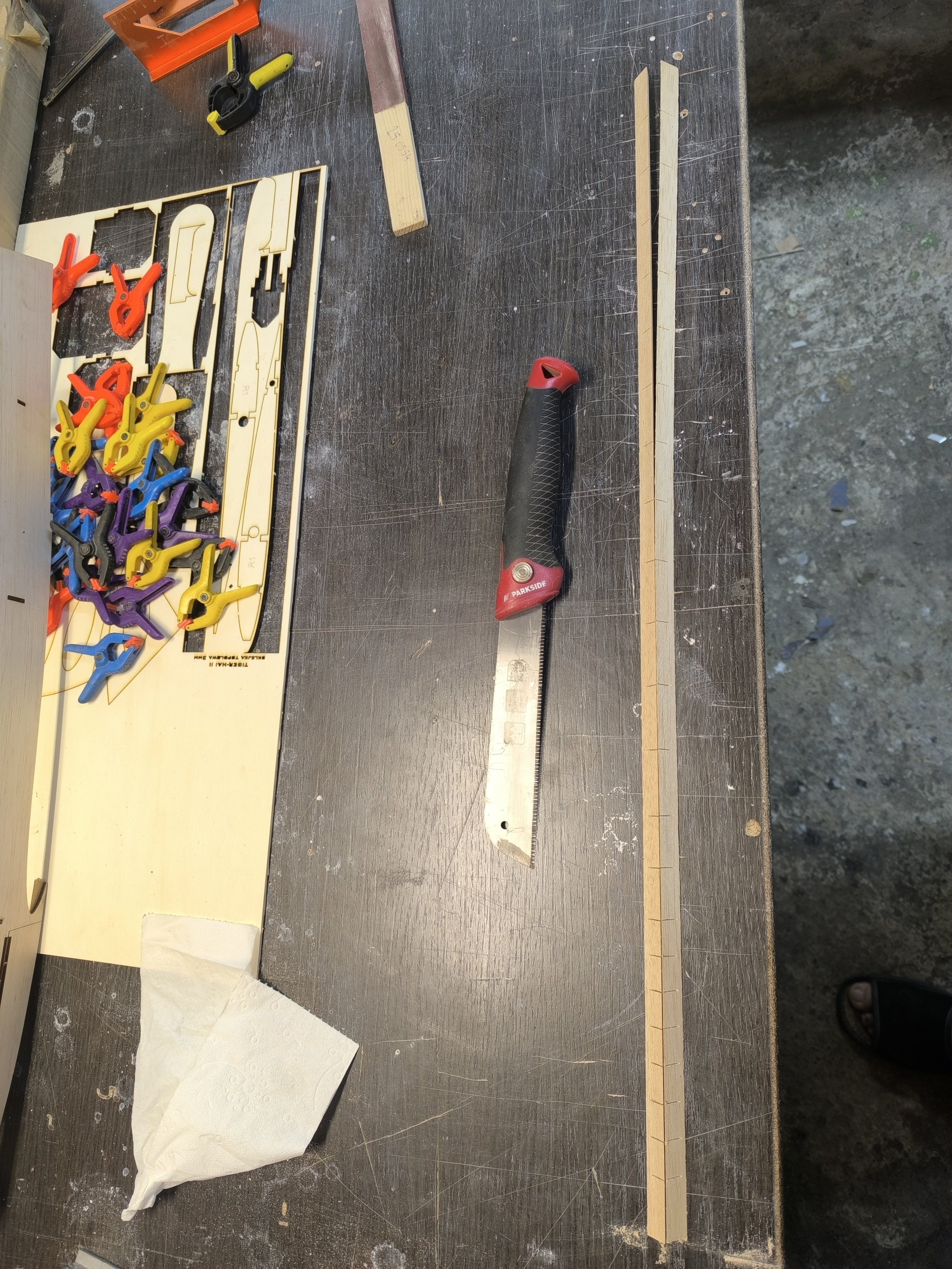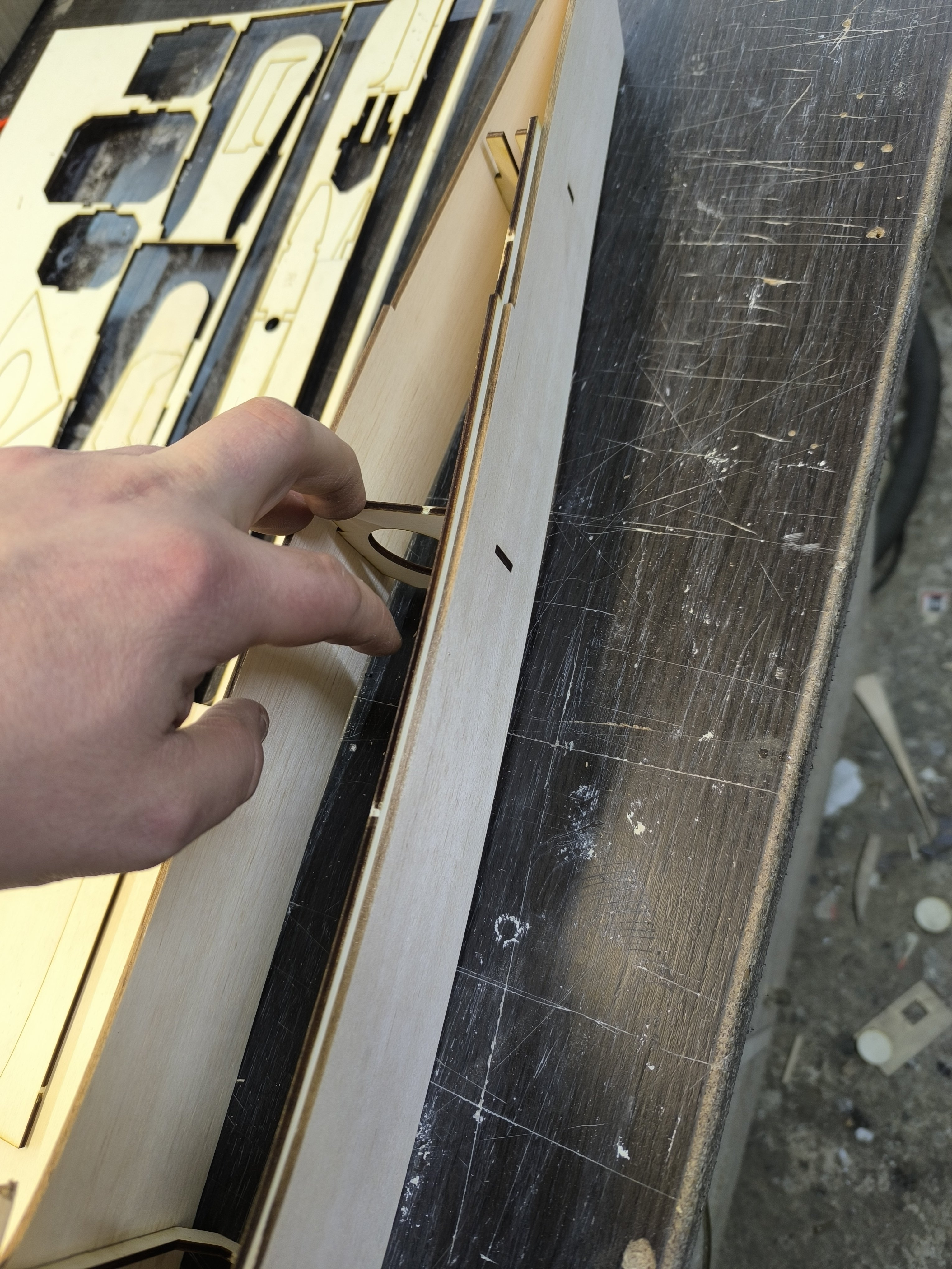 krzysiek.riese Opublikowano 2 godziny temu Autor Opublikowano 2 godziny temu Mały progress. Do kadłuba wklejone listwy trójkątne 10x10. Listwy te trzeba ponacinać żeby ułatwić wyginanie. Listwy wklejone na wikol a miejscami pomagałem sobie na CA. Odstawiamy na 2 godziny do schnięcia i idę na obiad. O oddali laser wycina żeberka oraz heligi. 5 minut temu, dariuszj napisał: A to dziwne, bo prawie wszyscy żałość zalewają alkoholem Hehe dobre ale tu psikusa zrobiła autokorekta. 1