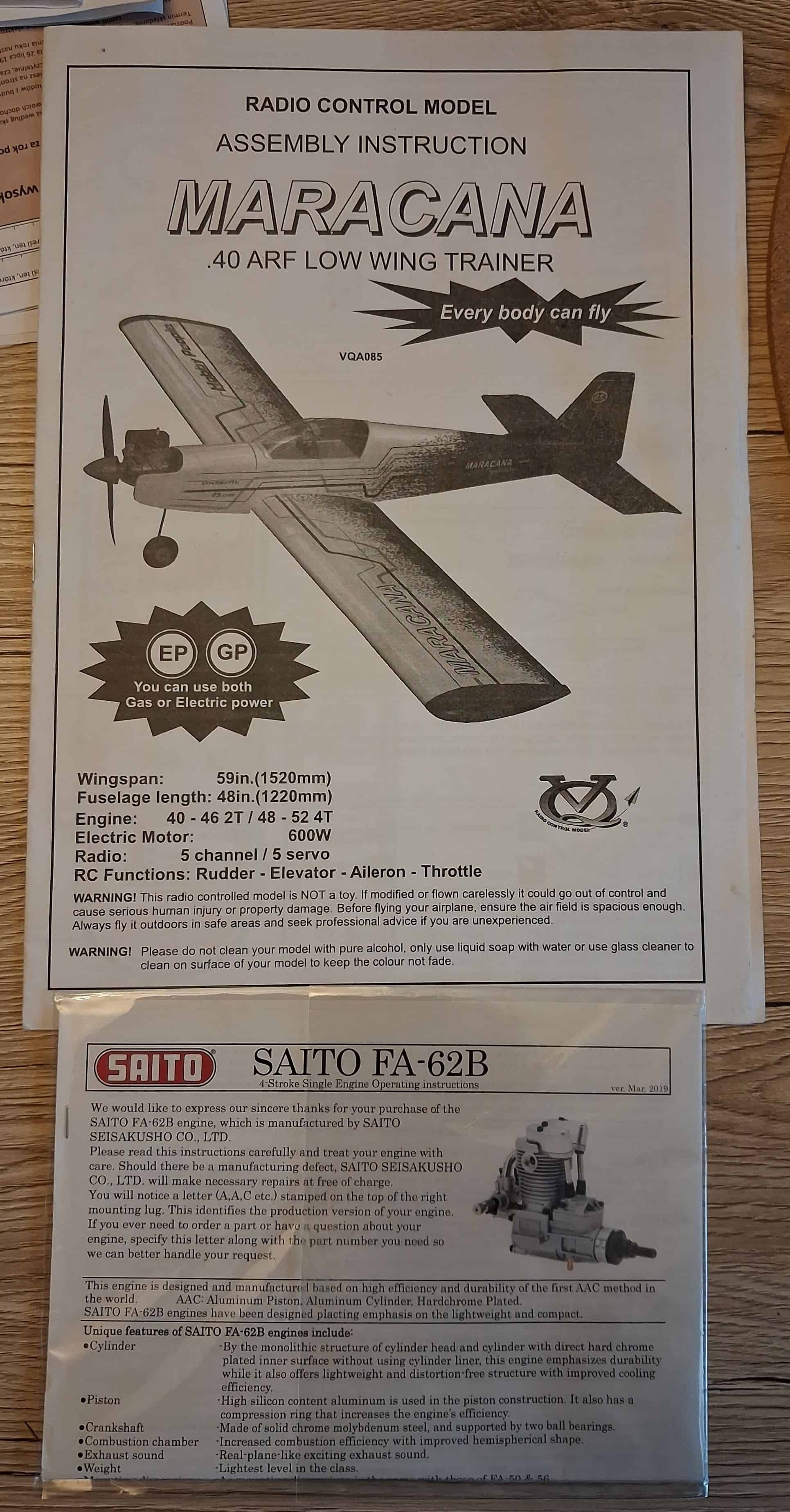 germanad Opublikowano 16 Marca Opublikowano 16 Marca Dzień dobry, Drodzy Koledzy - z uwagi na nadmiar modeli latających RC w moim hangarze (zasób ponad 20 szt.) i niedostatek miejsca, oferuję do nabycia model dolnopłata: VQ MARACANA 40 LOW WING Trainer 160cm z silnikiem Saito FA-62B - z pełnym wyposażeniem, bez odbiornika - w cenie 1388 zł zł. Koszt zakupu nowego modelu i nowego silnika wraz z z nowymi elementami wyposażenia i materiałami montażowymi to ok. 2776 zł - bez koszów robocizny! Oferuję nowy, zmontowany - w pełni wyposażony i gotowy do lotu model z nowym: silnikiem, śmigłem, kołpakiem, układem paliwowym (armaturą zbiornika), nowymi serwomechanizmami, nowym akumulatorem zasilającym i nowym wyłącznikiem - w cenie stanowiącej połowę (50%) kosztów! Stan modelu - dokładnie jak na zdjęciach i w poniższym opisie (pkt. 1. - 12.)! Odbiór modelu - na miejscu w Jaśle (w mieszkaniu, względnie na naszym Lądowisku IKAR Jasło, gdzie istnieje możliwość uruchomienia silnika, sprawdzenia układu sterowania i kołowania - przy sprzyjającej pogodzie). Nowy silnik Saito FA-62B ze śmigłem APC 12X6" i kołpakiem z podstawą duralową zainstalowałem bezpośrednio w modelu - w celu wstępnego dotarcia na ziemi i wykonania oblotu. Wstępne dotarcie silnika (zgodnie z zaleceniami producenta SAITO w instrukcji) i kilkuminutowy oblot z użyciem paliwa: Optimix 12 – 12% nitro 4-Stroke / 20% KLOTZ przebiegły wzorcowo (paliwo o składzie: Metanol: 68%, Nitrometan: 12%, Olej syntetyczny KLOTZ: 20% - mieszanka paliwa do 4-suwów zawierająca 12% nitrometanu i 20% w pełni syntetycznego oleju Klotz, paliwo przeznaczone do silników samolotowych, śmigłowcowych i łodzi). Silnik uruchamia się błyskawicznie i pracuje nienagannie, model jest prawidłowo wyważony i zachowuje się w locie znakomicie! Obecnie model jest w pełni gotowy do lotów. Do eksploatacji sugeruję nadal to paliwo, także po zupełnym dotarciu silnika KOSZTORYS w [ZŁ] - bez kosztów robocizny: 1. Model VQ MARACANA (klasa 46 EP-GP) ARF - VQ-Models - 895,94 zł https://modele.sklep.pl/samolot-maracana-klasa-46-ep-gp-arf-vq-models-p-45502.html 2. Klej CA JOKER rzadki 20g (nakrętka z igłą) - 5,50 zł https://nastik.pl/produkt/klej-ca-joker-rzadki-20g-nakretka-z-igla/ 3. Żywica epoksydowa 30-min. KAVAN 100g - 39,90 zł https://nastik.pl/produkt/zywica-epoxydowa-30-min-kavan-100g/ 4. Silnik SAITO FA-62B - 1229,99 zł https://nastik.pl/produkt/saito-fa-62b/ 5. Śmigło APC 12x6" 22,99 zł https://modelemax.pl/pl/130-smigla-apc?page=4 6. KOŁPAK Z PODSTAWĄ ALU 63 mm CZERWONY - 49,99 zł https://modelemax.pl/pl/podstawa-aluminium/8689-kolpak-z-podstawa-alu-63-mm-czerwony [kołpak plastikowy z zestawu dołączam] 7. WĘŻYK DO PALIWA 2,5/5 mm / 1mb Q-model (286-C) - 6,99 zł https://modelemax.pl/pl/wezyki-opaski-zaciski-metanol/33082-wezyk-do-paliwa-25-5-mm-1mb-q-model-286-c 8. Filtr paliwa KAVAN - 4,95 https://nastik.pl/produkt/filtr-paliwa-kavan/ 9. Serwomechanizm DDELUXE HITEC HS-322HD (gaz, lotki 2x, ster wysokości, ster kierunku) - 74,90 x 5 szt. = 374,50 zł https://nastik.pl/produkt/hitec-hs-322hd/ 10. Pakiet zasilający ENELOOP 4,8V/2000mAh NIMH RX SANYO (KAV33.1051404) płaski - 101,99 https://modelemax.pl/pl/pakiety-nimh-nicd/15415-eneloop-48v-2000mah-nimh-rx-sanyo-kav331051404-plaski 11. PRZEDŁUŻACZ DO SERW FUTABA 30 cm / skrętka (2001) [do serwa lotek] - 3,99 x 2 szt. = 7,98 zł https://modelemax.pl/pl/przedluzacze/16852-przedluzacz-do-serw-futaba-30-cm-skretka-2001 12. FUTABA WŁĄCZNIK SSW-J PROFI (0626) z kablem do ładowania - 35,99 https://modelemax.pl/pl/wlaczniki/32594-futaba-wlacznik-ssw-j-profi-0626-z-kablem-do-ladowania =============================================================================================================================================================================== Razem koszt zakupu: 895,94 + 5,50 + 39,90 + 1229,99 + 22,99 + 49,99 + 6,99 + 4,95 + 374,50 + 101,99 + 7,98 + 35,99 = 2776,71 zł Wykonane prace montażowe i instalacyjne - zabudowa elementów: prasowanie poszycia foliowego; nałożenie - przy użyciu roztworu "30 minutowej" żywicy epoksydowej 2-składnikowej ze spirytusem - powłoki gruntującej i ochronnej, wzmacniającej konstrukcję i odpornej na paliwo metanolowe - na dostępnej powierzchni wewnętrznej kadłuba; sklejenie obu połówek płata żywicą, zainstalowanie napędów orczykowych na lotkach, zainstalowanie serwomechanizmów napędu lotek, wyregulowanie i skonfigurowanie napędu lotek; prace przygotowawcze przy kadłubie do montażu usterzenia - wklejenie statecznika poziomego i pionowego, zainstalowanie serwomechanizmów oraz napędów orczykowych steru wysokości/głębokości i kierunku w kadłubie - wyregulowanie i skonfigurowanie sterowania; wykonanie mocowania łoża silnika do grodzi, wywiercenie otworów w łożu silnika, zainstalowanie silnika z przedłużką regulacji iglicy gaźnika; poszerzenie otworów w kołpaku pod śmigło; zainstalowanie wyłącznika z gniazdem ładowania; zainstalowanie serwomechanizmu gazu wraz z wykonanym orczykiem napędowym gazu i popychaczem na snapach kulowych, wycięcie otworu w grodzi pod popychacz gazu, wyregulowanie sterowania; zamontowanie goleni podwozia podwozia głównego i przedniego, zamontowanie kół podwozia, kółka przedniego; wykonanie sprzęgu kółka przedniego ze sterem kierunku, wykonanie instalacji w zbiorniku paliwa, dopasowanie i zainstalowanie rurek w zbiorniku, zamknięcie i próba szczelności zbiornika paliwa, poziomowanie zbiornika w linii instalacji paliwowej - wykonanie otworu w pokrywie zbiornika i dopasowanie pokrywy, zabudowa zbiornika wraz z instalacją paliwową; ulokowanie akumulatora zasilającego w centropłacie na rzepach. Z pozdrowieniami Adam Langer / Jasło [członek Jasielskiego Stowarzyszenia Lotniczego IKAR im. Leszka Preisnera, emerytowany nauczyciel języka niemieckiego] e-mail: germanad@mm.pl tel.: 662063107