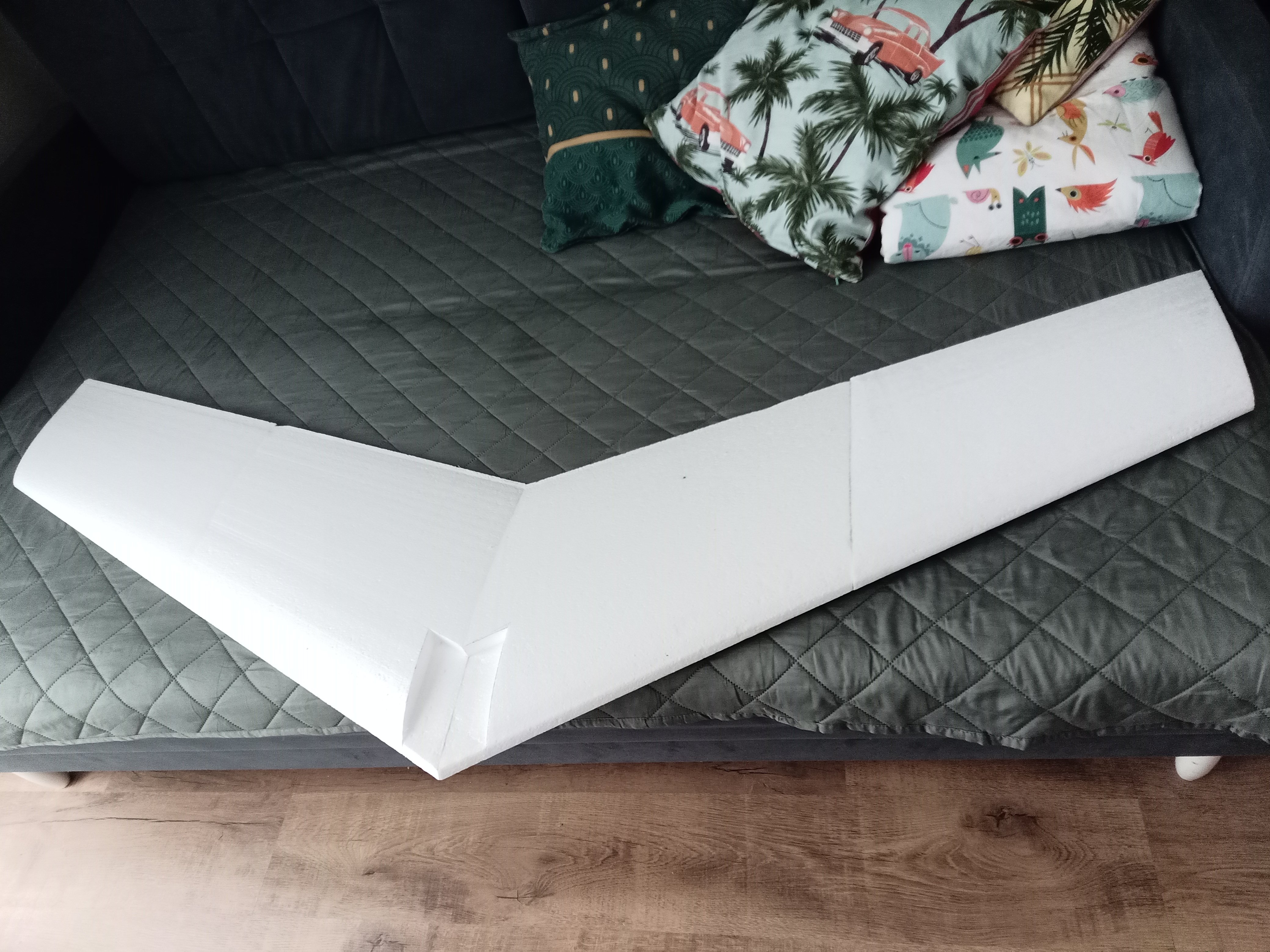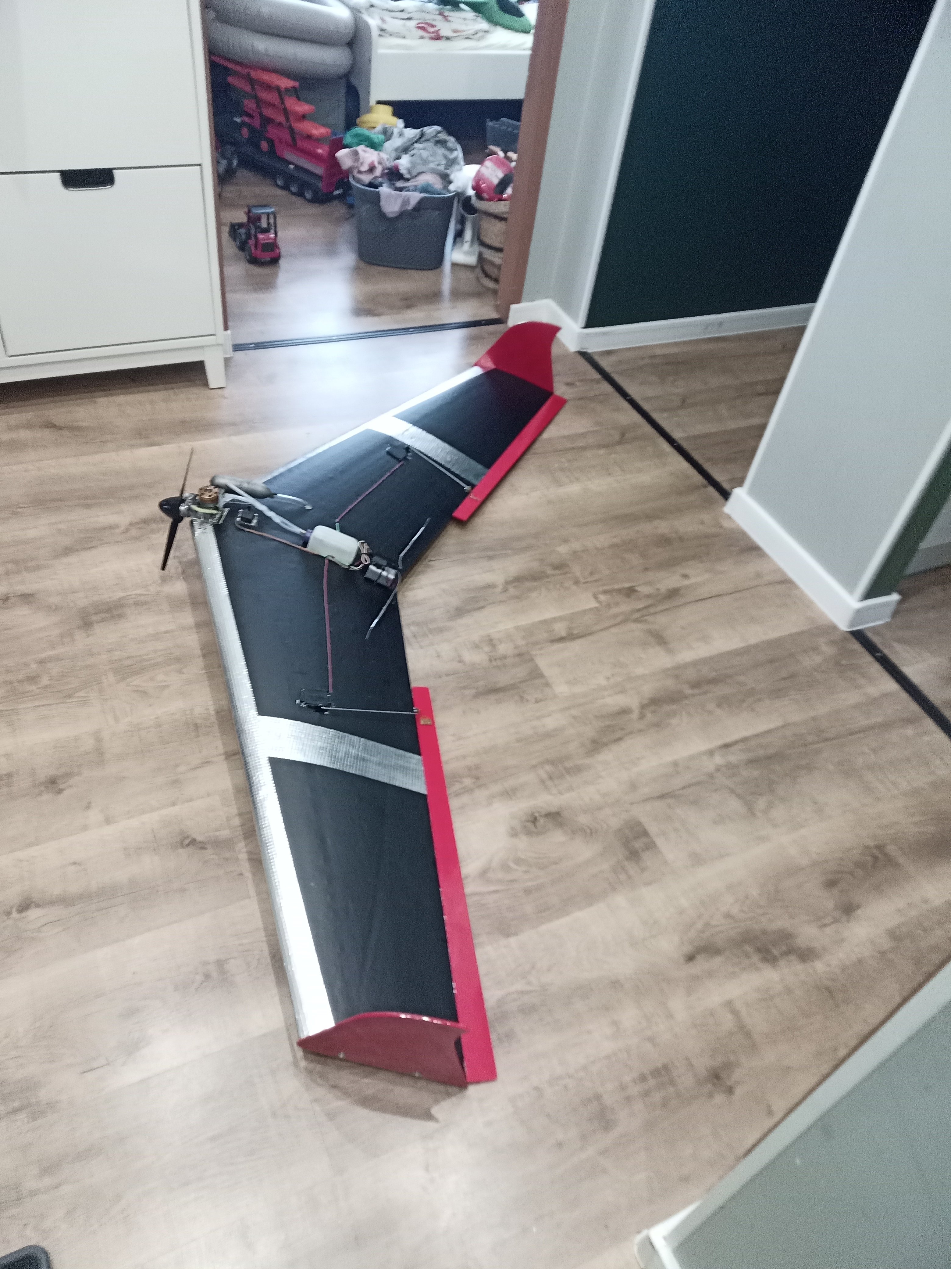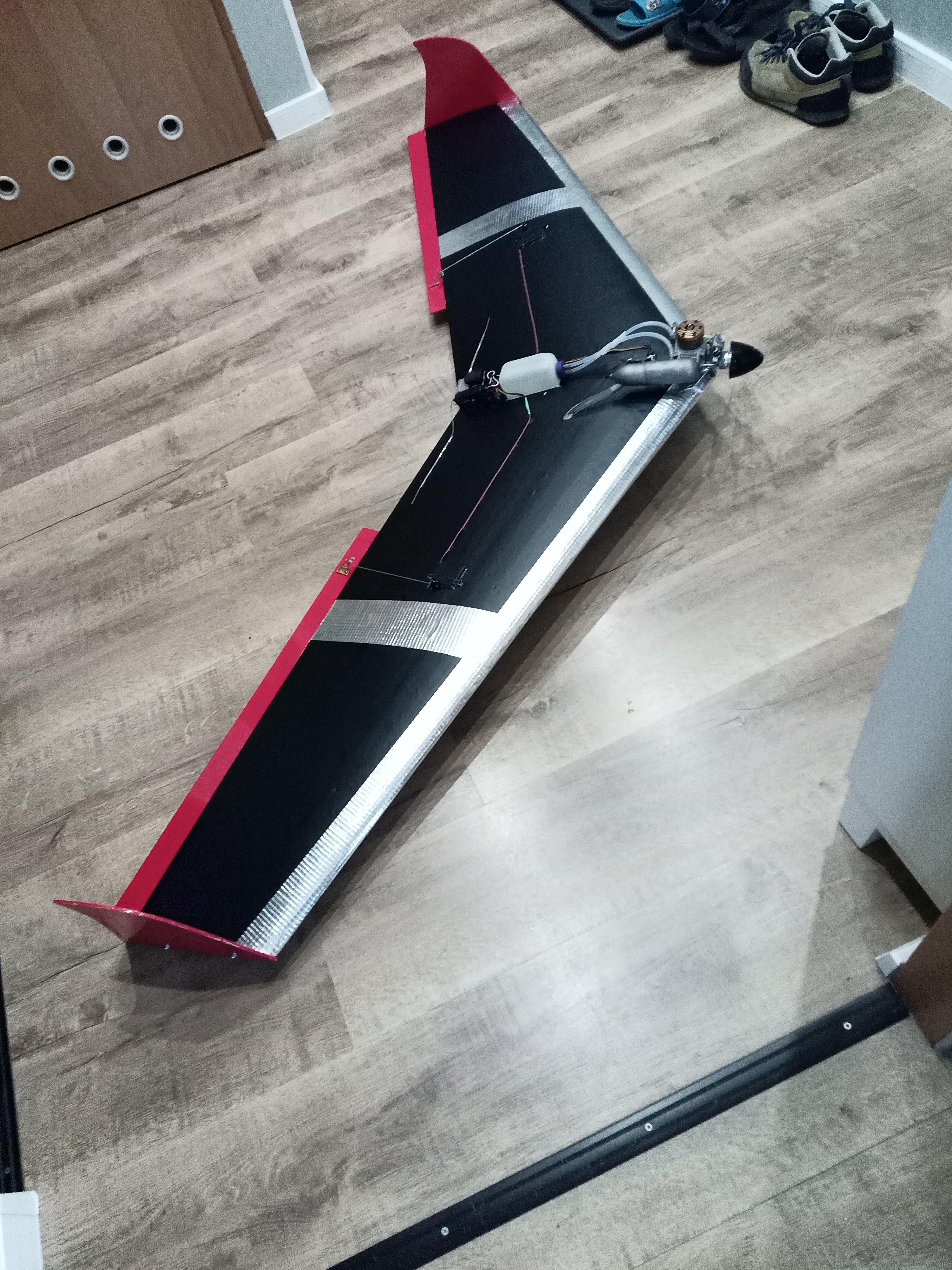 Konrad. Opublikowano 8 godzin temu Opublikowano 8 godzin temu Witajcie, Jakiś czas temu popełniłem konstrukcje bardzo znanego i popularnego skrzydełka, tylko z mniej popularnym napędem. Zamiast bezszczotki i lipola napęd tego mierzącego 1750mm rozpietości skrzydełka stanowi silnik GMS 4cc, co przy wadze startowej ok 1700g z paliwem daje całkiem fajne osiągi i długość lotu.Konstrukcja to rdzeń styro oklejony folią oracal , dźwigar stanowi zaś rurka węglowa 6mm przez całą długość płata. Model po zgaszeniu silnika szybuje jak gazeta...zaskakująco powoli i spokojnie. Daleko temu typowo zabawowemu wytworowi do modeli prezentowanych tu na forum, ale postanowiłem go pokazać z uwagi na zanikający trend montowania napędów spalinowych do tego typu modeli. Planując umieszczenie silnika ( i wybór napedu pchający vs.ciągnący- wynikające z tego problemy z wyważeniem) nie za bardzo było się na czym wzorować, udało mi się natknąć na jakieś dawne projekty Delt ze spalinkami, ale to raczej trend który już umarł. Jeśli się mylę to chętnie pooglądałbym zdjęcia dziwnych latadeł tego typu 1