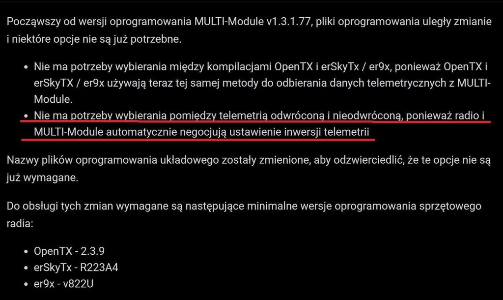 Piotter Opublikowano 18 Lutego 2021 Opublikowano 18 Lutego 2021 Bo 1.3.2.30 u mnie nie działa. Wrócę do tego co Kolega J-23 zacytował z dokumentacji multimodule: Od wersji 1.3.1.77 nastapiła zmiana w sposobie obsługi telemetri. Generalnie, z tego co sam wyczytałem, telemetria z modułu wewnętrznego leci bez inwersji, z modułu zewnętrznego z inwersją. Cóż, biorę się za czytanie wątku na RCGroups.com o Jumper T16, bo pewnie nie jestem pierwszym który nie może załapac o co w tym chodzi.
