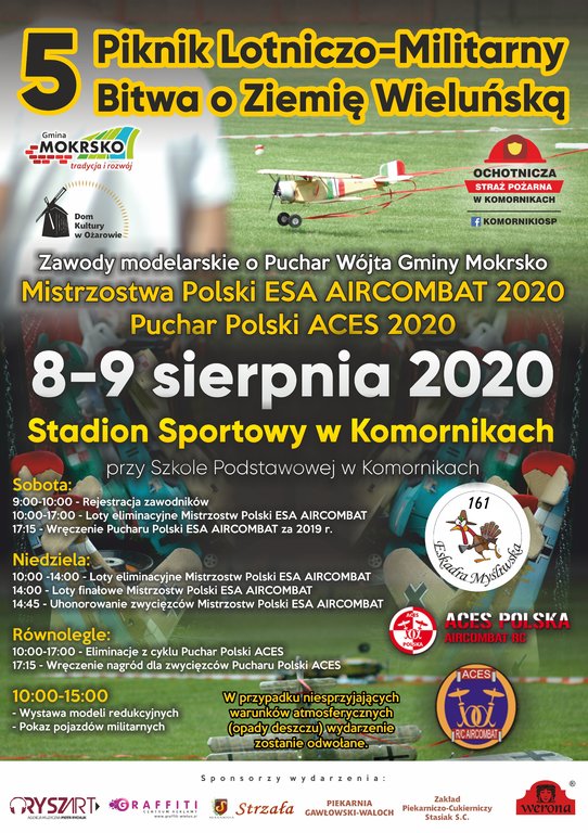 Grzegorz Nowak (W) Opublikowano 29 Lipca 2020 Autor Opublikowano 29 Lipca 2020 Lokalizacja: Boisko przy Zespole Szkoły i Przedszkola w Komornikach, gm. Mokrskohttps://goo.gl/maps/ZenLJxPQ7tkkAEyUA Kod: 4FX7+8M Komorniki Adres: Zespół Szkoły i Przedszkola 126, 98-345 Komorniki info: Piknik Lotniczo-Militarny 5. Bitwa o Ziemię Wieluńską Zawody modelarskie o Puchar Wójta Gminy Mokrsko Mistrzostwa Polski ESA AIRCOMBAT 2020 Puchar Polski ACES 2020 8-9 sierpnia 2020 Szkoła Podstawowa w Komornikach Sobota: 9:00-10:00 - Rejestracja zawodników 10:00-17:00 - Loty eliminacyjne Mistrzostw Polski ESA AIRCOMBAT 17:15 - Wręczenie Pucharu Polski ESA AIRCOMBAT za 2019 r. Niedziela: 10:00 -14:00 - Loty eliminacyjne Mistrzostw Polski ESA AIRCOMBAT 14:00 - Loty finałowe Mistrzostw Polski ESA AIRCOMBAT 14:45 - Uhonorowanie zwycięzców Mistrzostw Polski ESA AIRCOMBAT równolegle: 10:00-17:00 - Eliminacje z cyklu Puchar Polski ACES 17:15 - Wręczenie nagród dla zwycięzców Pucharu Polski ACES 10:00-15:00 - Wystawa modeli redukcyjnych - Pokaz pojazdów militarnych - Występy lokalnych artystów i informacje dodatkowe: Nocleg zapewniamy na miejscu w namiotach wojskowych, zapewniamy łóżka "kanadyjki", prośba o zabezpieczenie się w materace/karimaty i śpiwory Nocleg możliwy będzie już od piątku wieczorem, proszę tylko o wcześniejszą informację na maila: GNowak@poczta.fm Co do wyżywienia, informacje przekażę w przyszłym tygodniu W sobotę wieczorem ognisko "Integracyjne" Kwestie higieniczne - zaplecze w szkole, prysznice - trzeba dojechać na najbliższy Orlik ( kilka kilometrów) Oczywiście, ze względy na popularyzację naszego pięknego hobby zapraszam wszystkich do zabrania każdego sprzętu do latania, jaki kto lubi - będzie na to czas i miejsce motoszybowce, drony, akrobatki i wszelkie inne wynalazki mile widziane !! Rejestrację on-line rozpoczniemy w przyszłym tygodniu