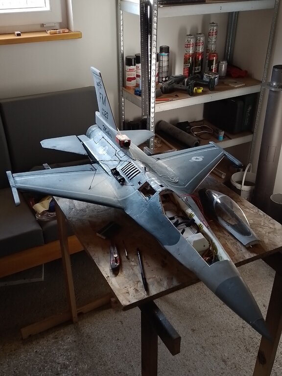 Atomizer Opublikowano 26 Sierpnia 2022 Autor Opublikowano 26 Sierpnia 2022 Dalsze prace nad trzecim F-16 ! Wczoraj testowanie napędu... VID_20220825_201614.mp4 EDF ładnie się kręci na 4s. VID_20220825_201036~2.mp4 Tak jak widać na zdjęciach wykonałem dodatkowe wloty u góry jaki od dołu, żeby EDF lepiej zasysał powietrze. Z plastikowego wiaderka wyciąłem kratki , które wczoraj późnym wieczorem wkleiłem. Pomaluje się farbą i będzie super ! ?