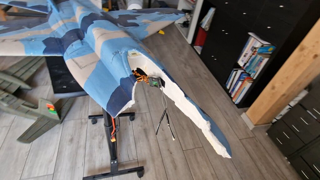 robertus Opublikowano 28 Sierpnia 2023 Autor Opublikowano 28 Sierpnia 2023 W sumie nie ma czym. Rozpiętość: 111cm Długość: 160cm EDF FMS 70mm 4S Akumulator 4S 3000mAh Waga do lotu 1650g Serwa lotki, taileron, kierunek. Tak wygląda zamontowany edf. Oblałem go pianą dla wzmocnienia mocowania i utworzenia tuneli. Nie, nie są gładkie. Za edf zrobiłem po prostu kierownicę która rozdziela powietrze na dwa strumienie A tak wygląda kieszeń na akumulator pod kabina pilota. Na razie muszę do ważyć mu ogon 10g ciężarkiem.