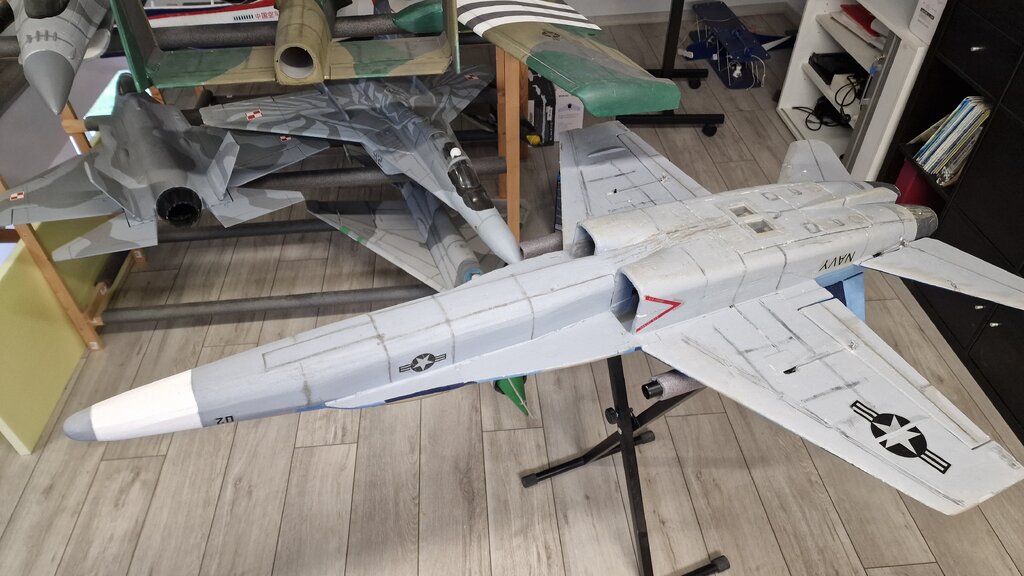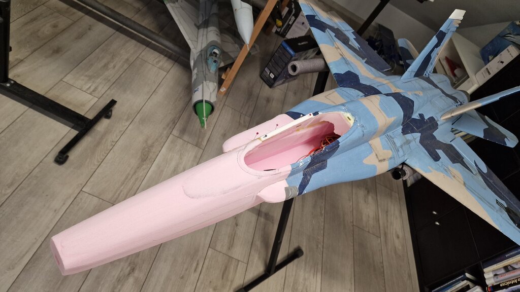 Ta odpowiedź cieszy się zainteresowaniem. robertus Opublikowano 1 Września 2023 Autor Ta odpowiedź cieszy się zainteresowaniem. Opublikowano 1 Września 2023 Przerobiłem wylot F-18 i teraz mam ciągu tyle ile trzeba. Myślę, że źle nie wygląda i w locie nie będzie widać. Po trymowaniu, ograniczeniu wychyleń i przesunięciu nieco do tyłu środka ciężkości lata idealnie. Film z dzisiejszych prób tutaj Malowanie będzie inspirowane agresorem, inspirowane bo mam trudność ze znalezieniem odpowiednich kolorów farb a mieszać za bardzo nie chcę bo potem pod poprawki będzie trudno dobrać. Coś w tym stylu Efcia jest bardzo duża, ledwo mieści mi się do skody fabii kombi 5